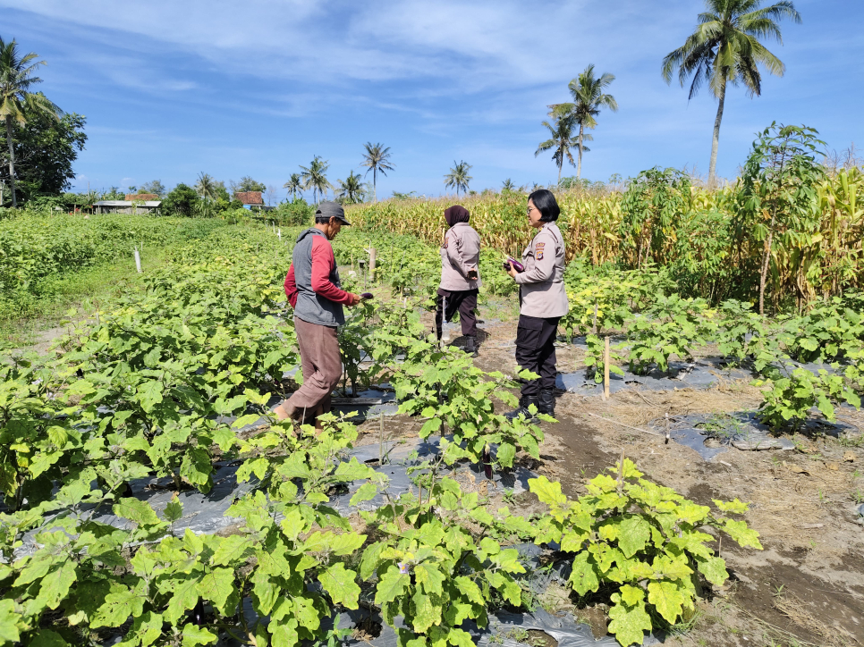 Kanit Binmas Polsek Wates, AKP Widada Haryana, bersama Iptu Siwi Setyaningsih, Aiptu Ety M, dan Aipda Suprihatin, menyambangi Bapak Tamtomo, seorang petani di area tegalan Pedukuhan Keboan, Kalurahan Karangwuni, Kapanewon Wates, yang tengah memanen terong. Selain itu, tim juga melakukan pengecekan tanaman jagung sebagai bagian dari monitoring ketahanan pangan.