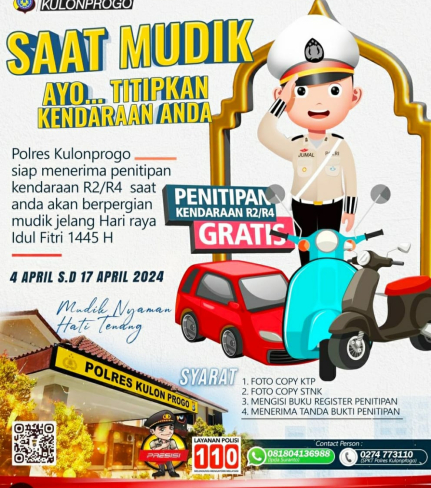 "Kami Polres Kulonprogo dalam perayaan mudik lebaran tahun 2024 ini kami didukung dengan TNI melaksanakan operasi terpusat dengan sandi ketupat Progo 2024 selama 13 hari yang melibatkan 408 personal Polri dalam rangka pengamanan idul Fitri 1445 hijriah sehingga masyarakat nantinya dapat merasakan dan merayakan idul Fitri dengan rasa aman " kata Wakapolres Kulon Progo, Kompol Martinus Griavinto Sakti, S.I.K., M.M.,