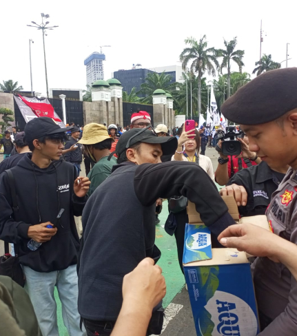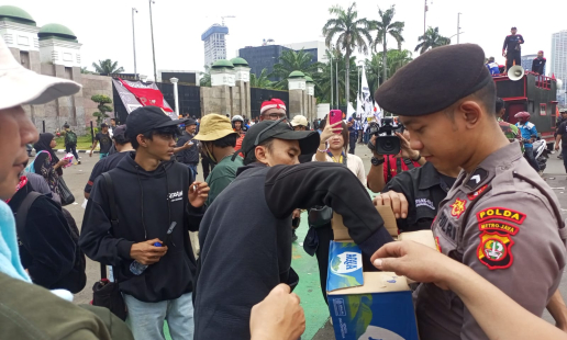 Jakarta - Di sela-sela pengamanan aksi unjuk rasa elemen buruh di depan Gedung DPR/MPR RI, ...