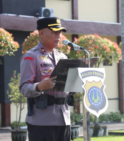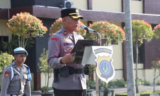 Kulonprogo - Wakapolres Kulonprogo Kompol Muhamad Sholeh S.H.,M.M memimpin apel pagi gabungan ...