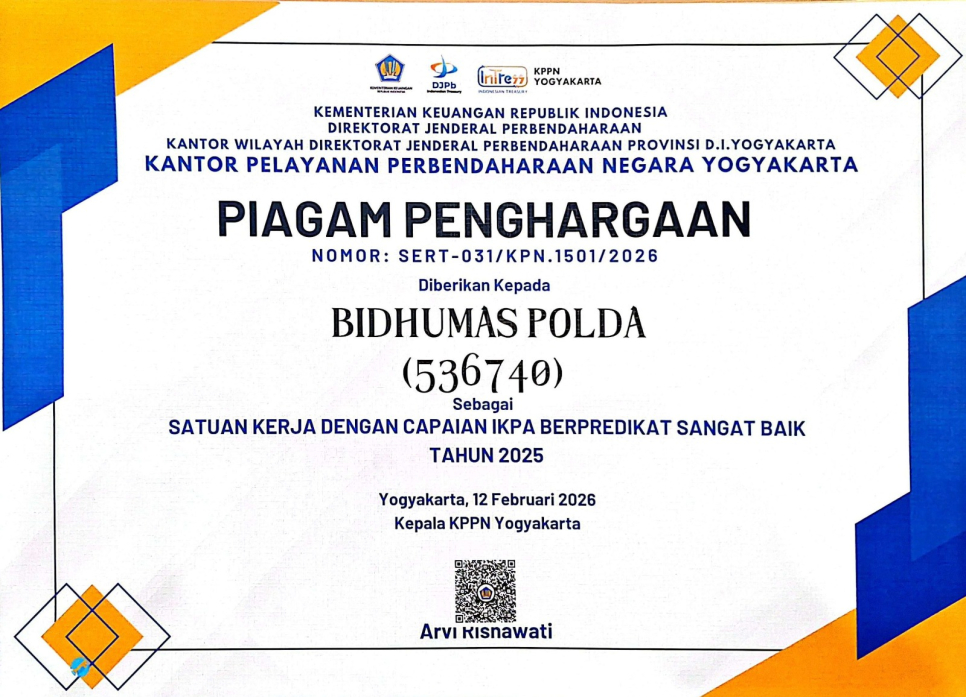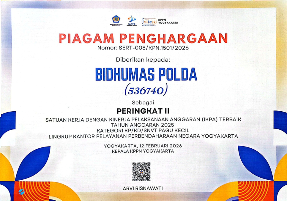 Pada kesempatan ini Bidang Humas Polda DIY mendapatkan penghargaan atas Capaian IKPA Berpredikat Sangat Baik. Sekaligus meraih Peringkat II Satuan Kerja dengan Kinerja Pelaksanaan Anggaran (IKPA) Terbaik Tahun Anggaran 2025.