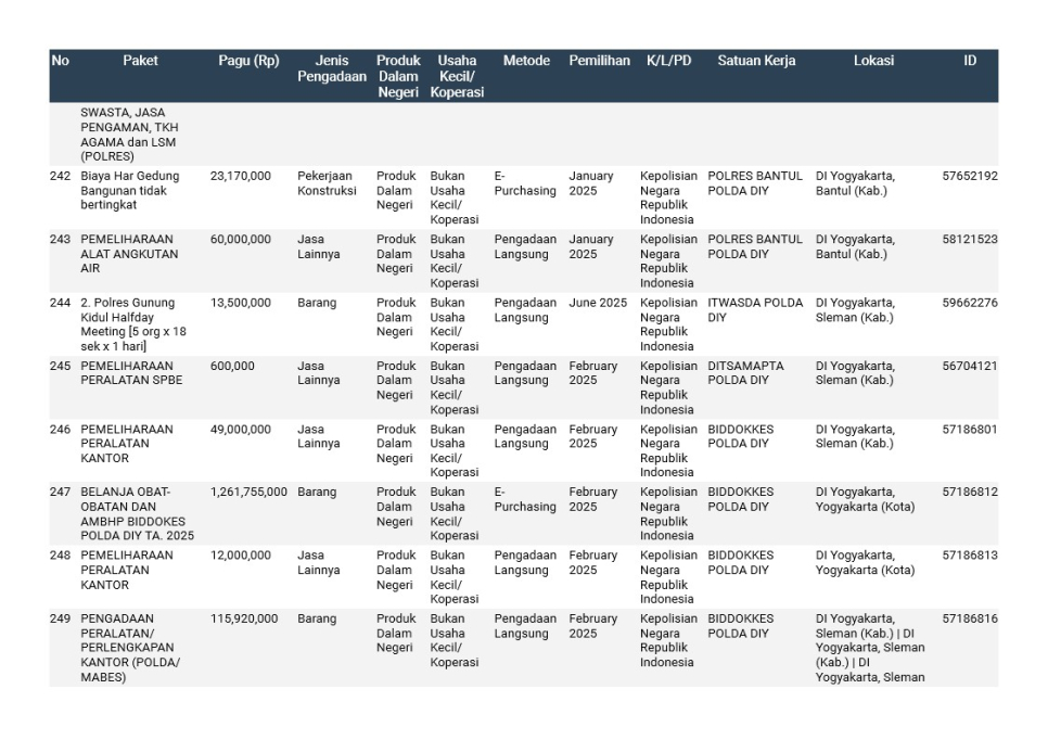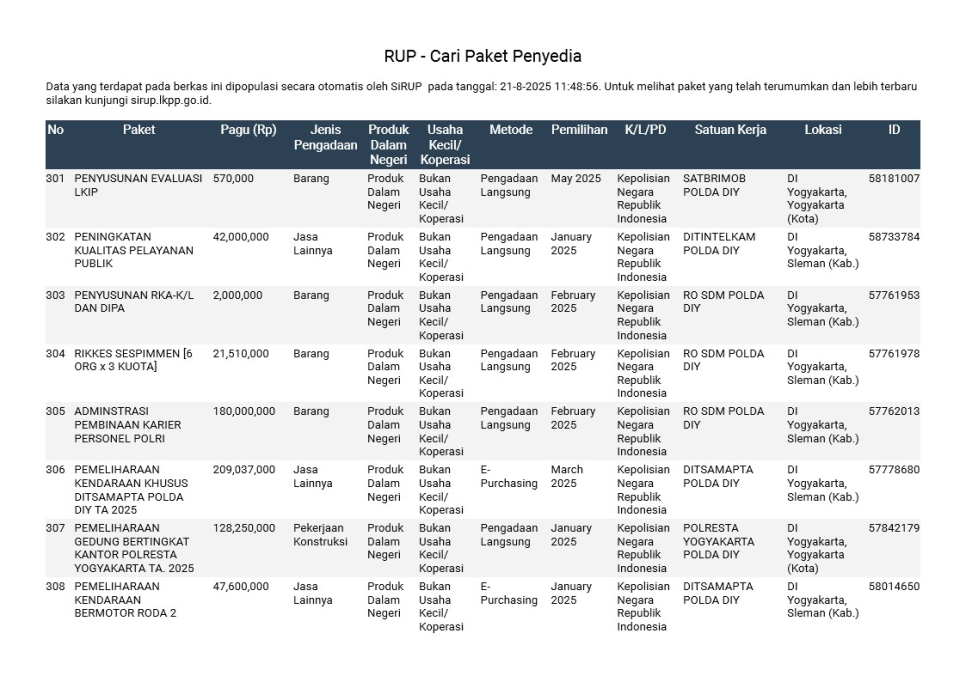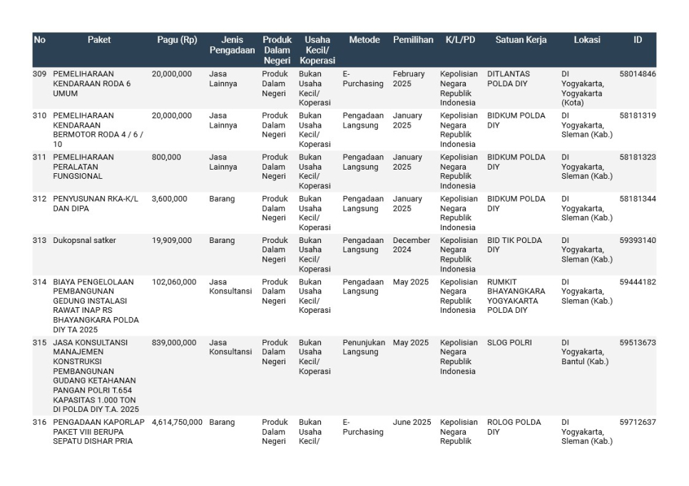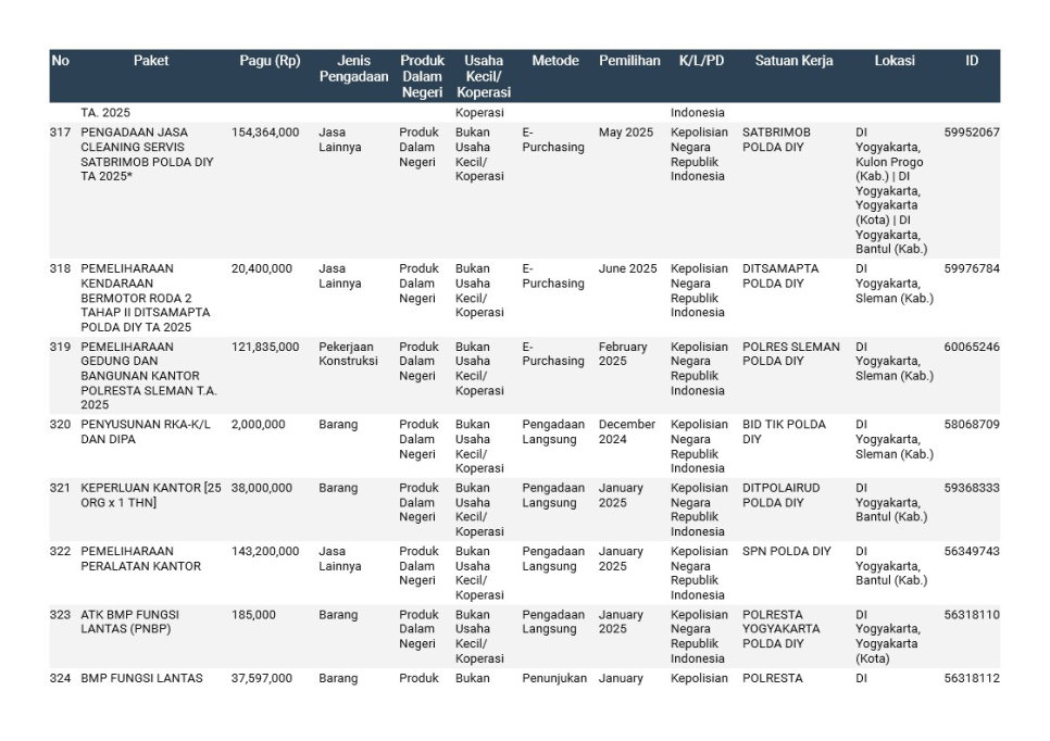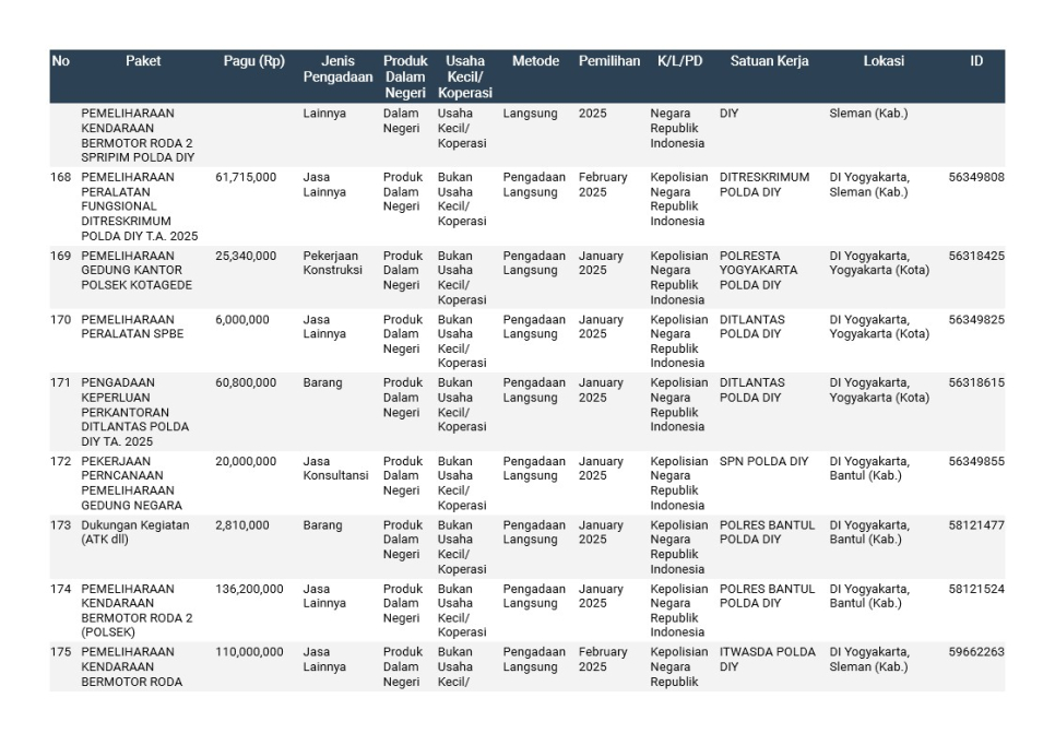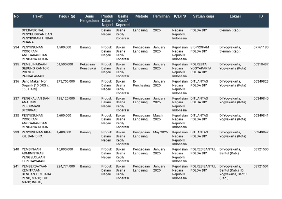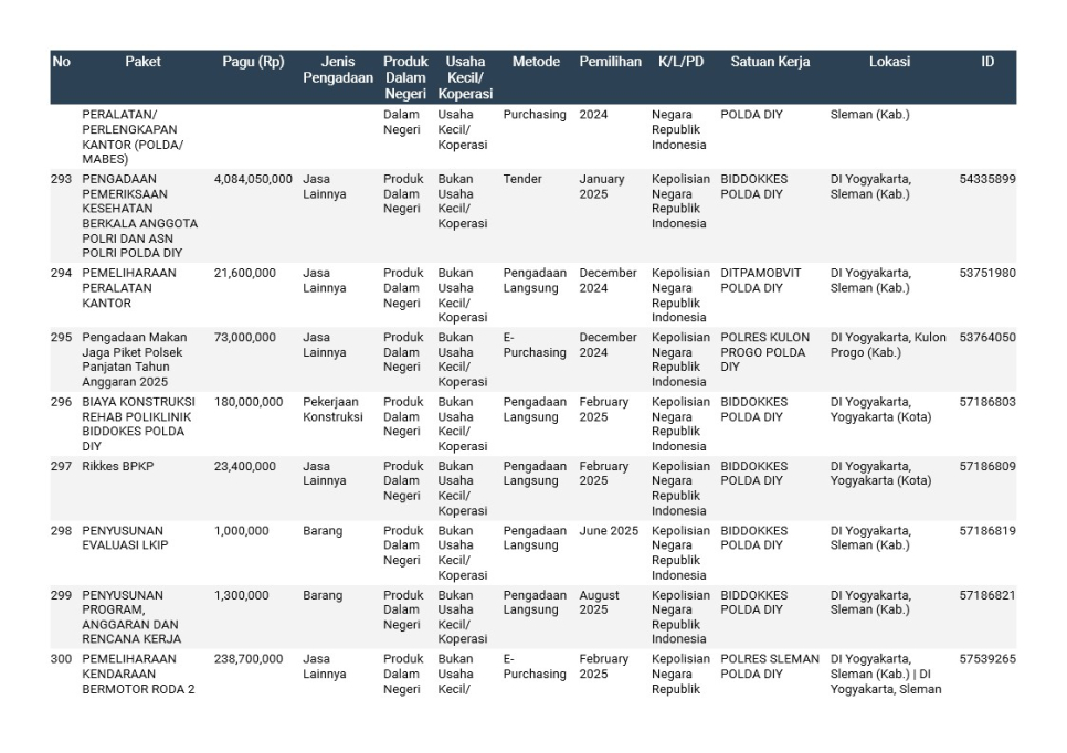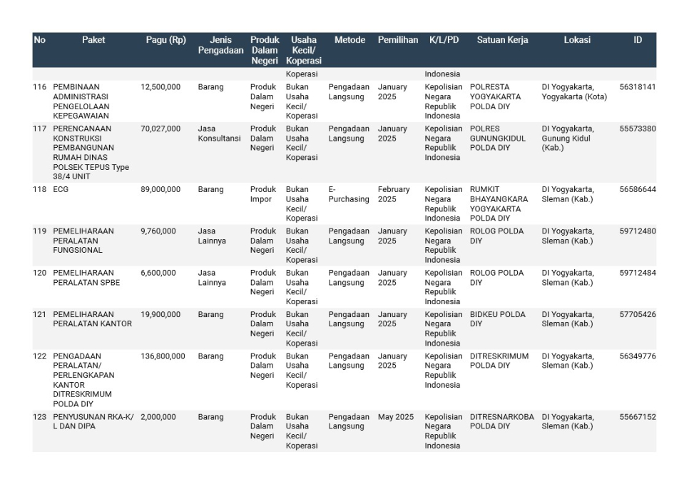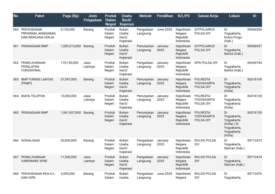 Rencana Umum Pengadaan (RUP) Polda DIY TA. 2025