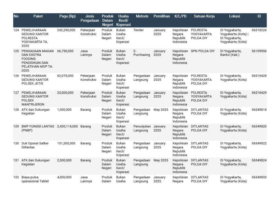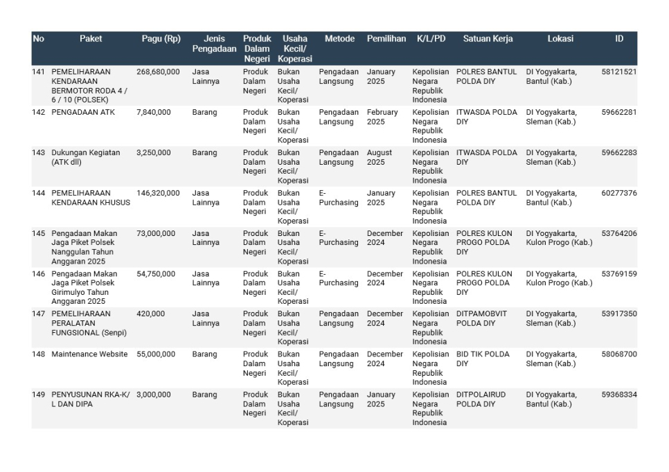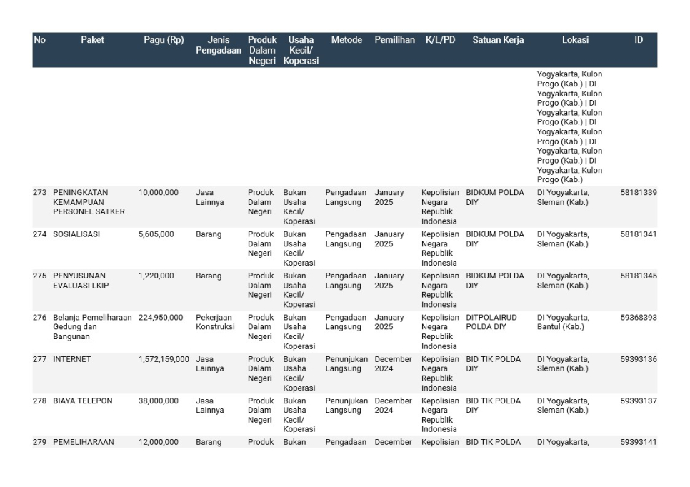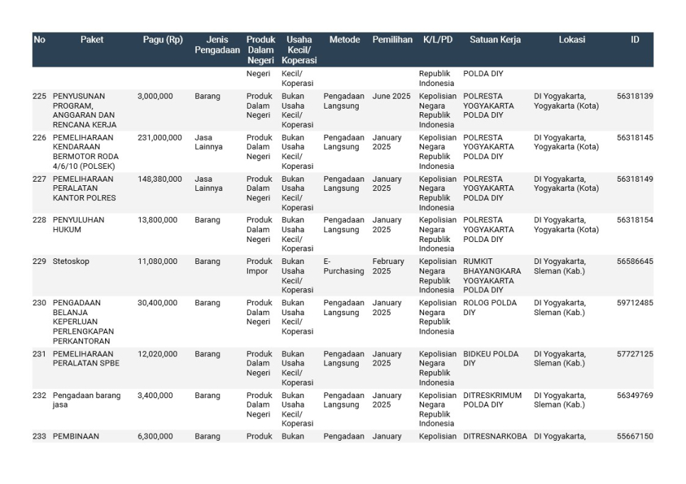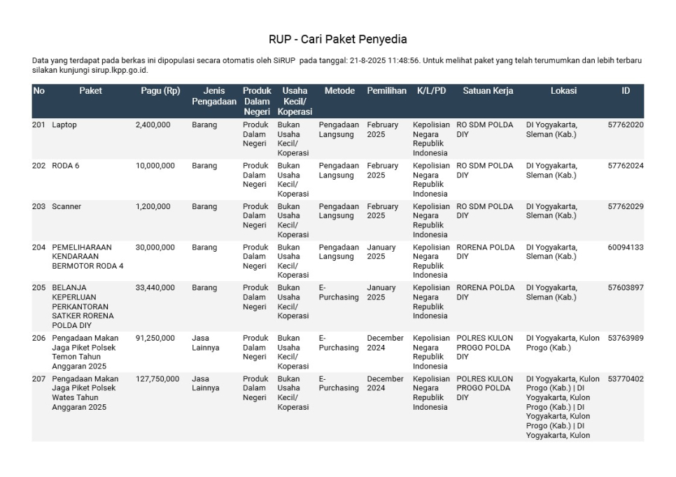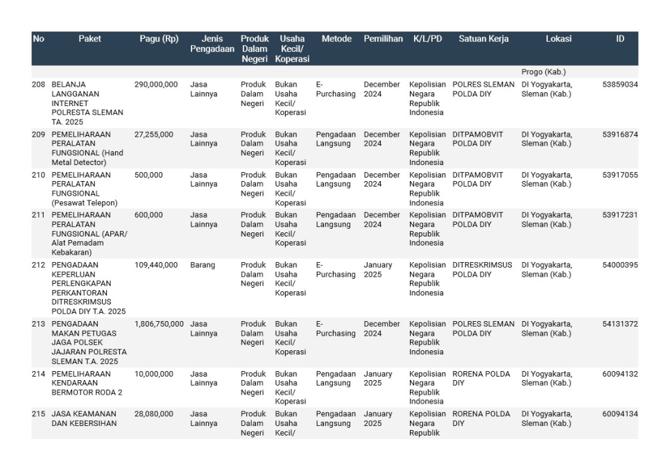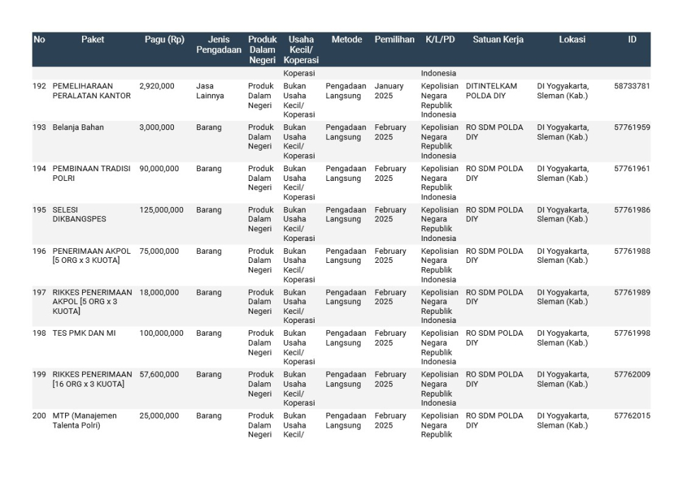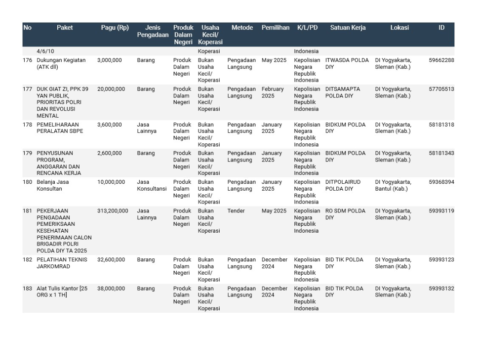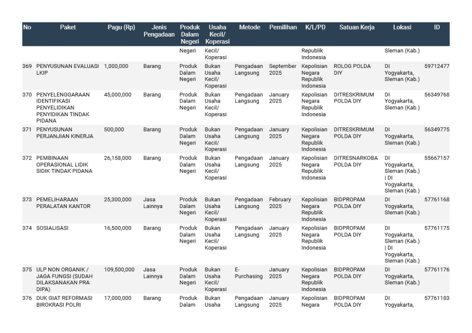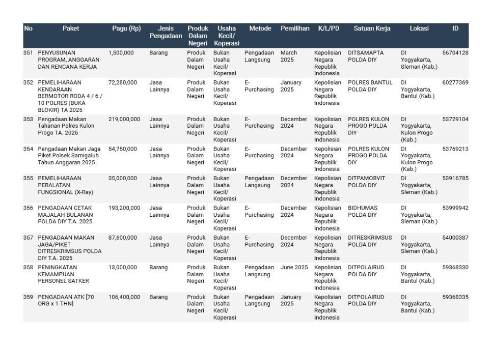 Rencana Umum Pengadaan (RUP) Polda DIY TA. 2025