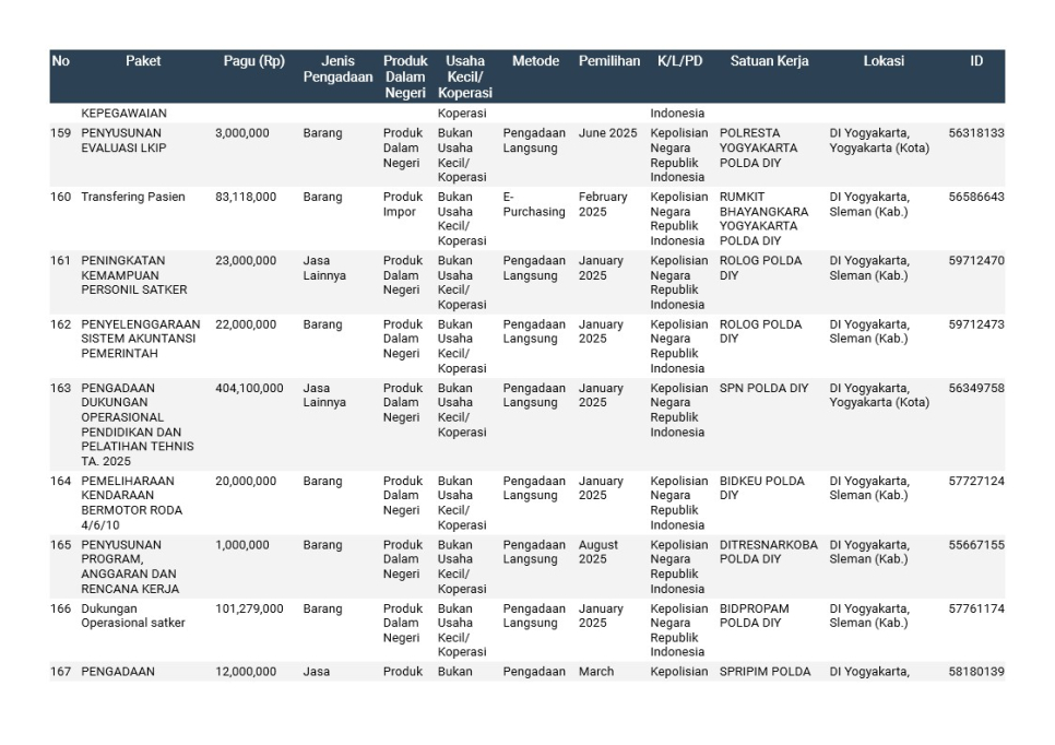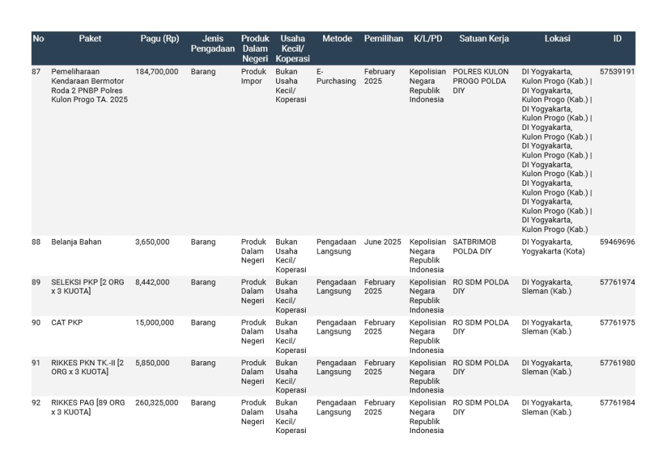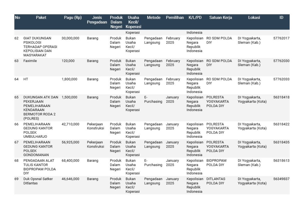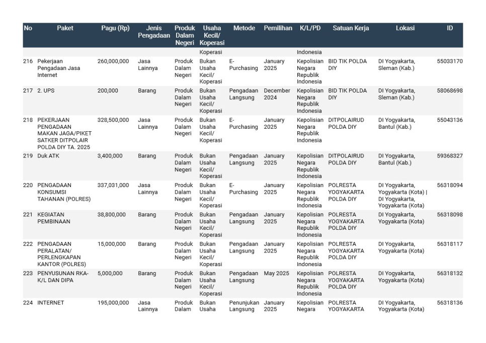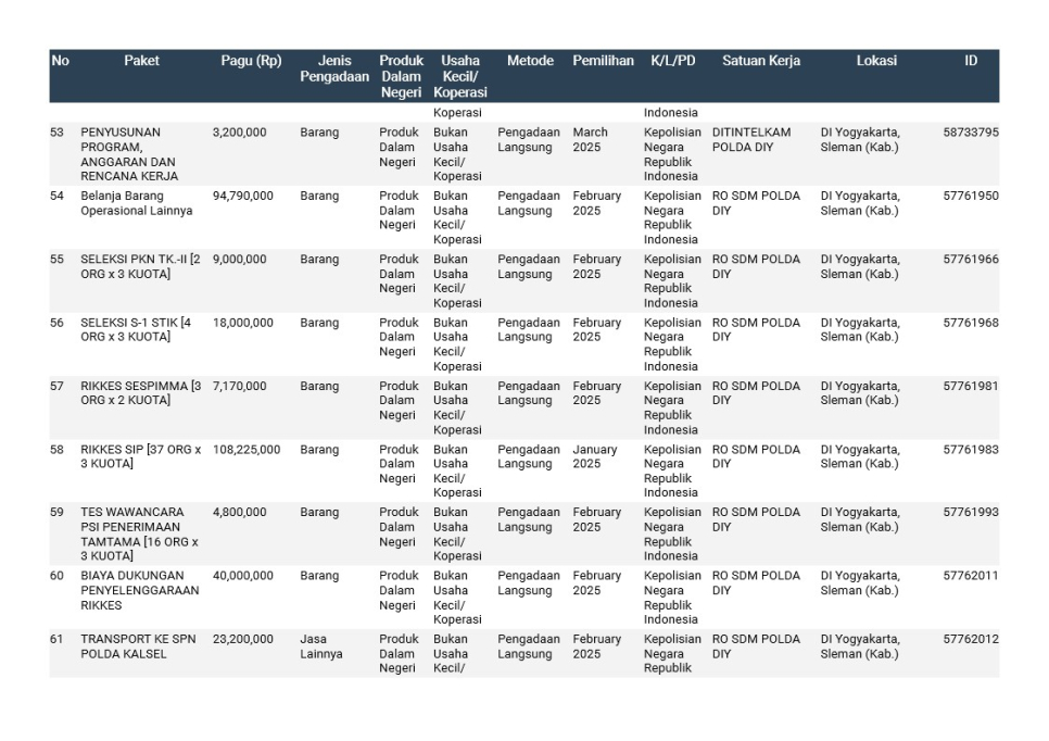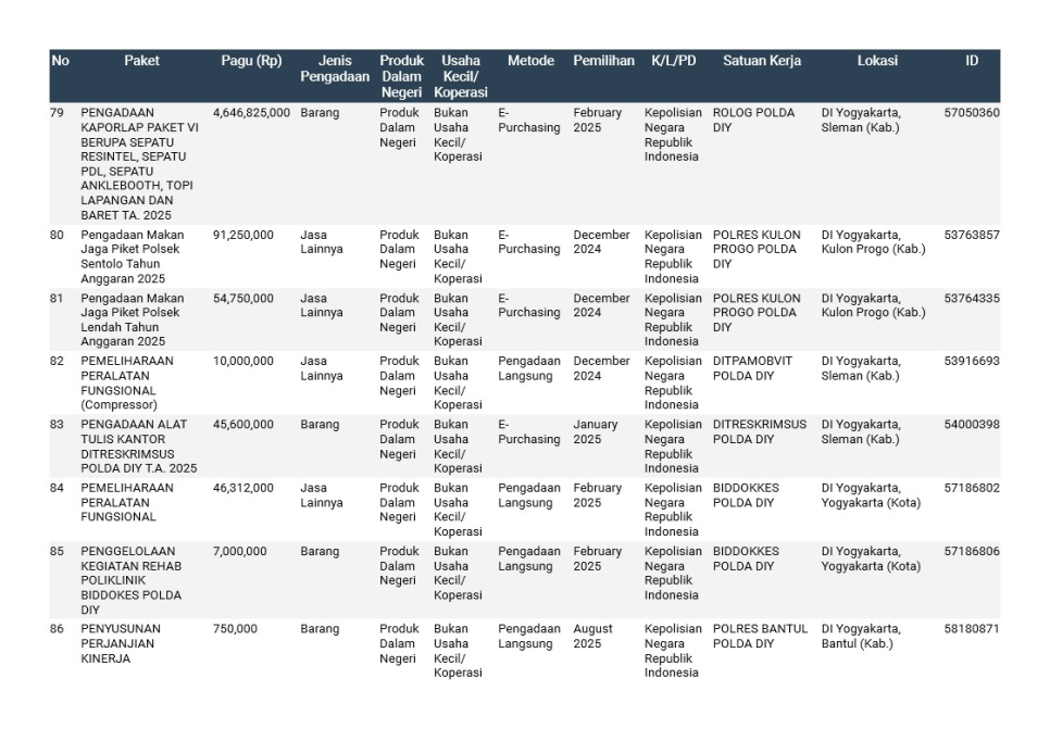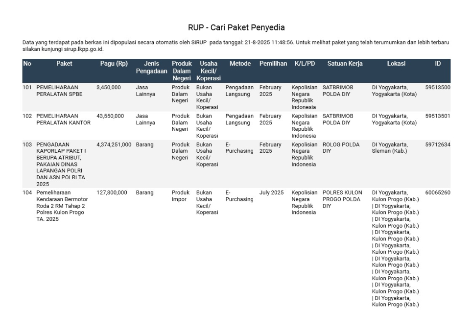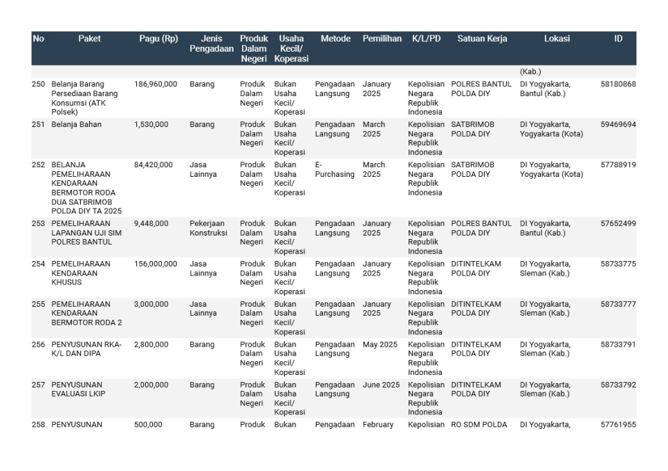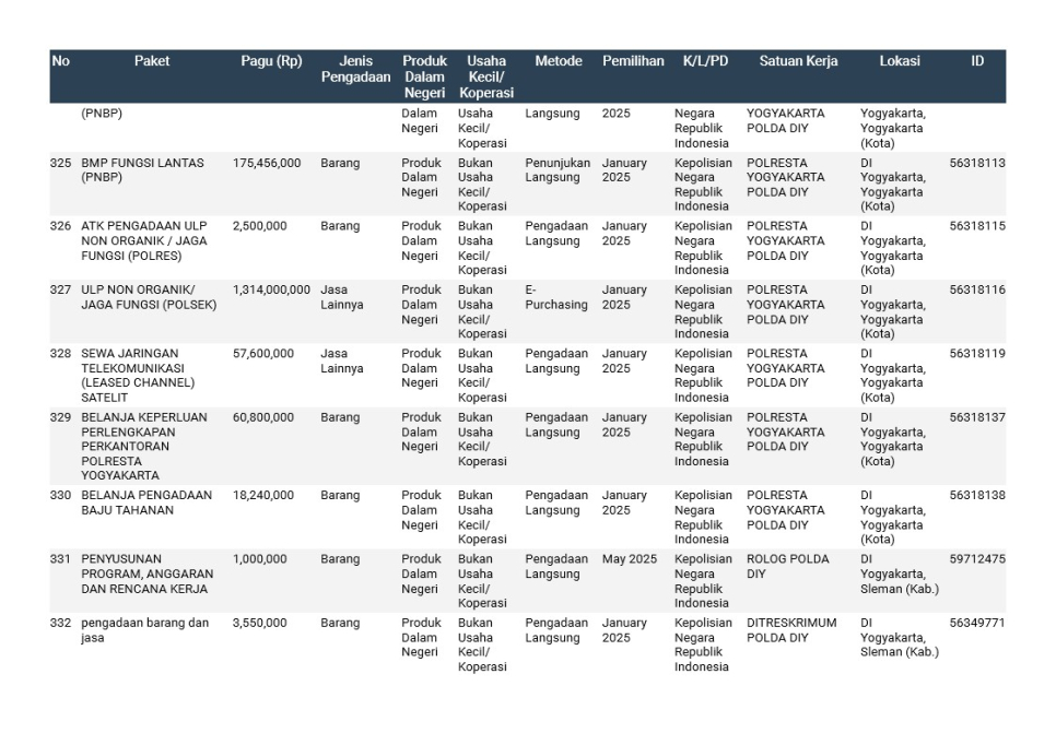 Rencana Umum Pengadaan (RUP) Polda DIY TA. 2025