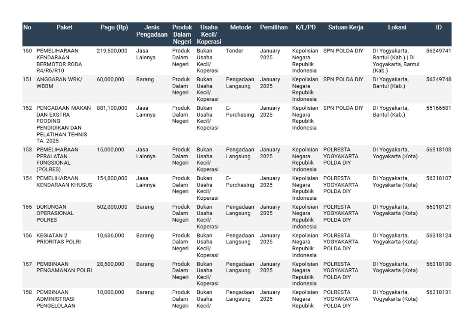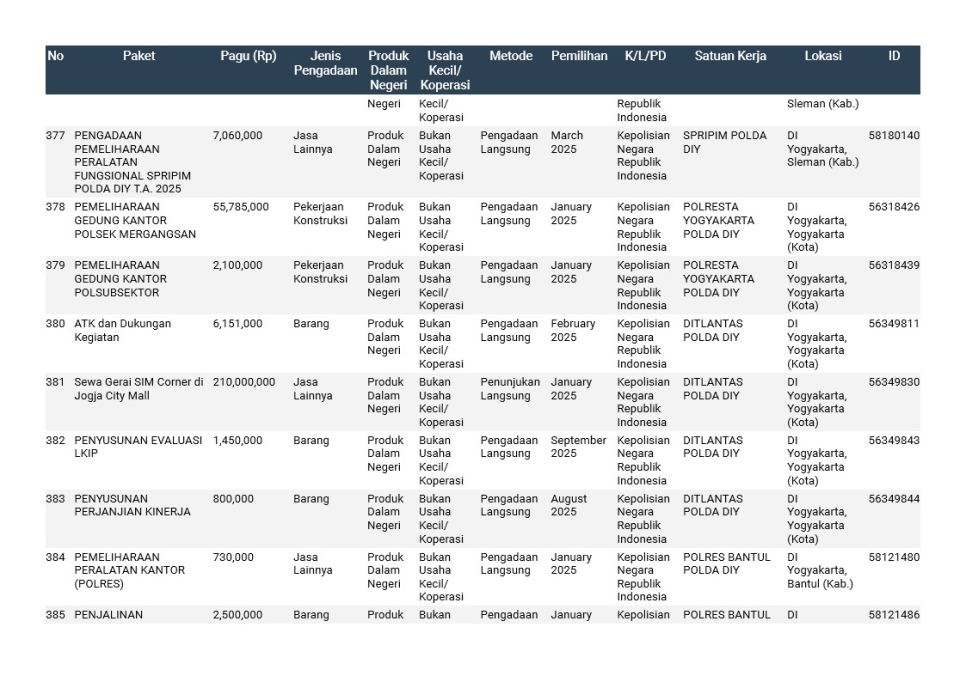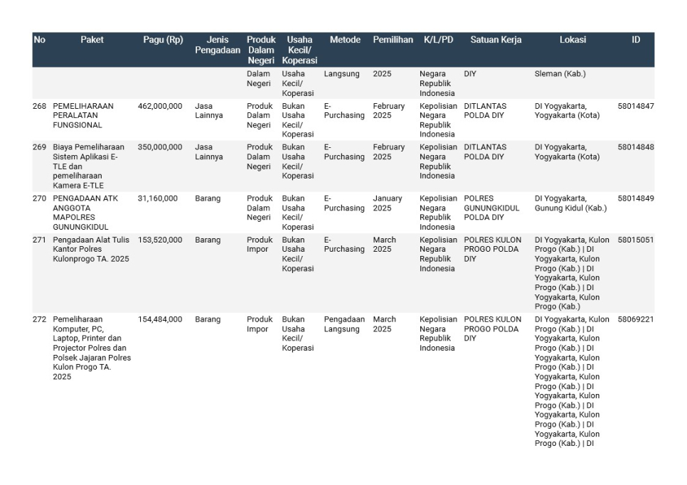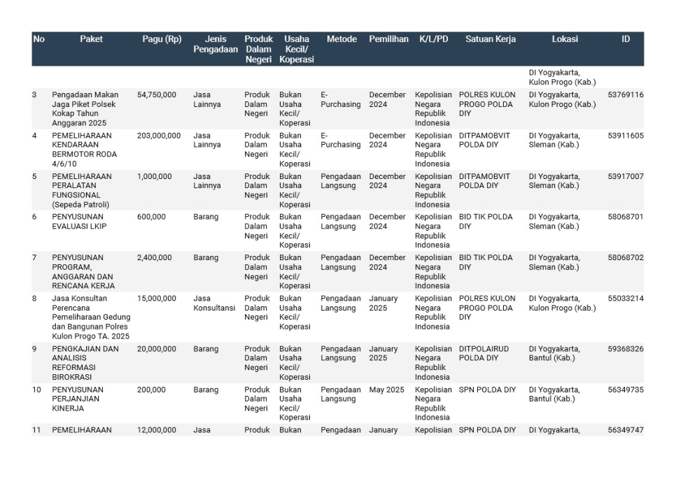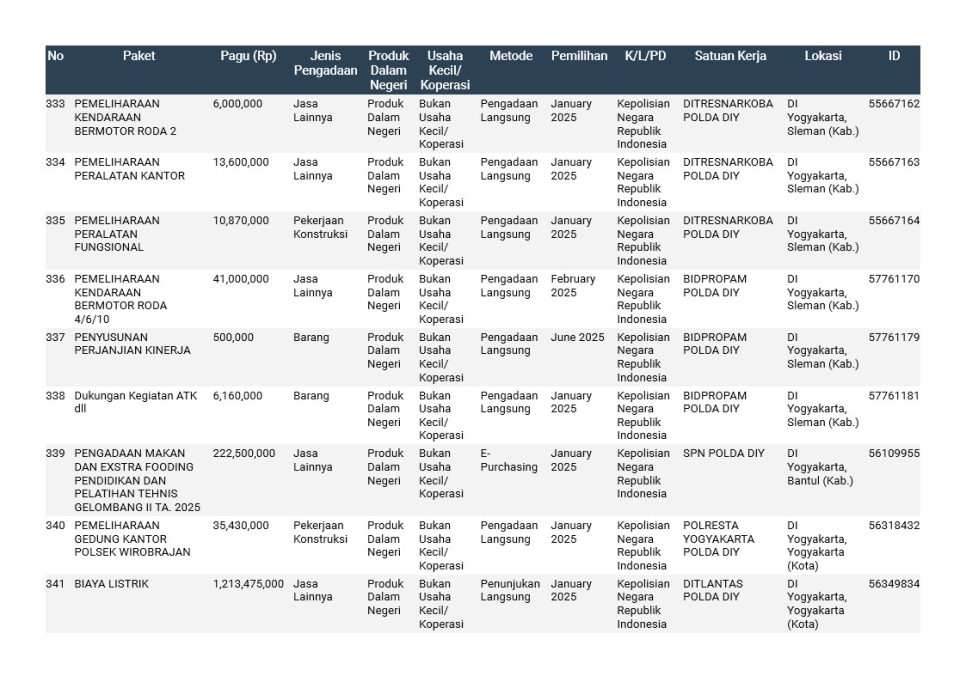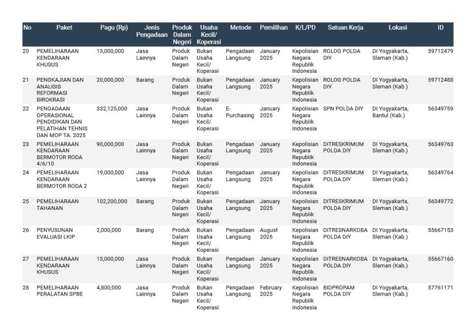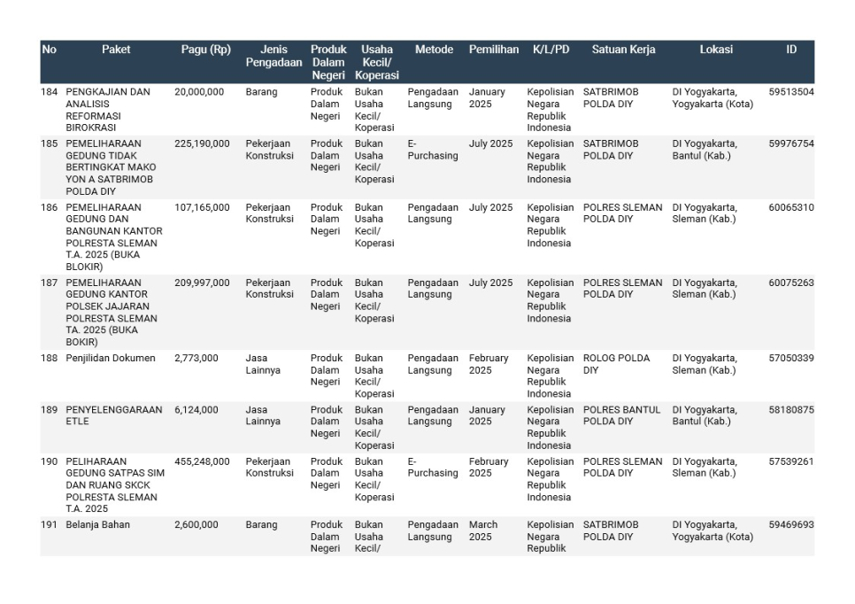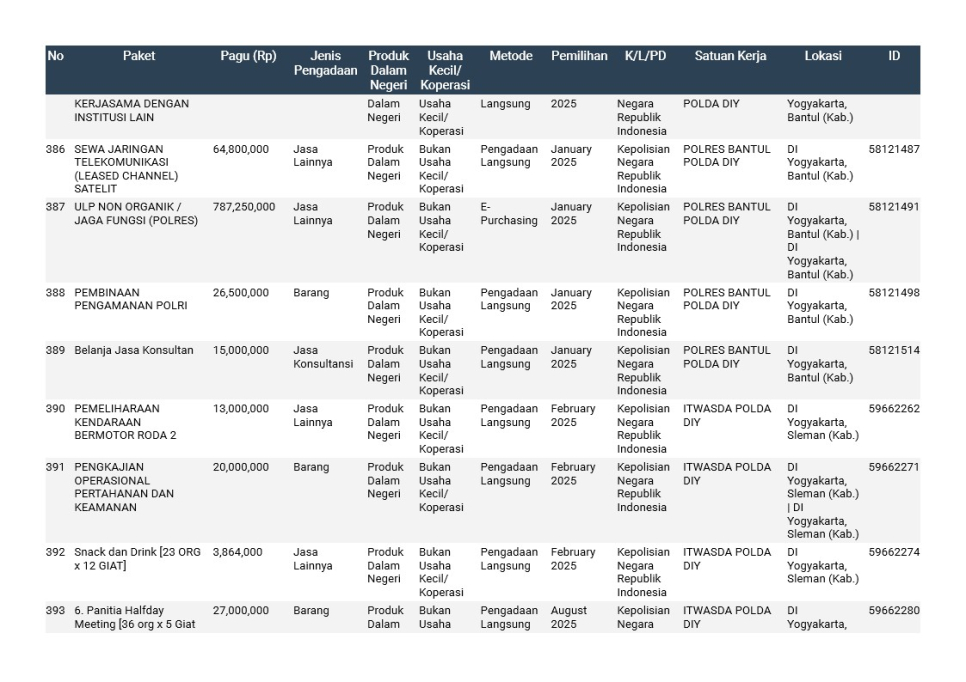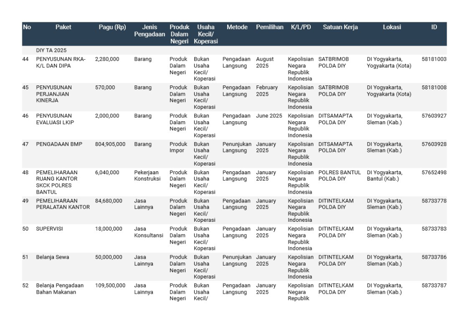 Rencana Umum Pengadaan (RUP) Polda DIY TA. 2025