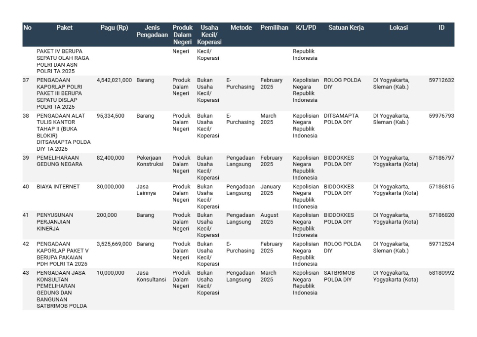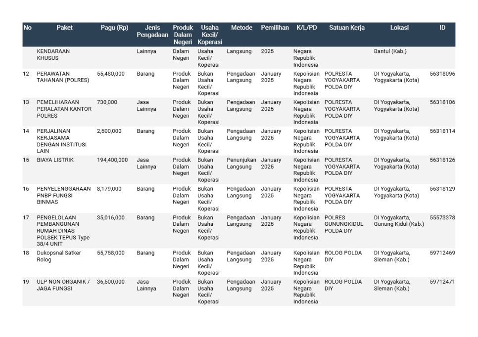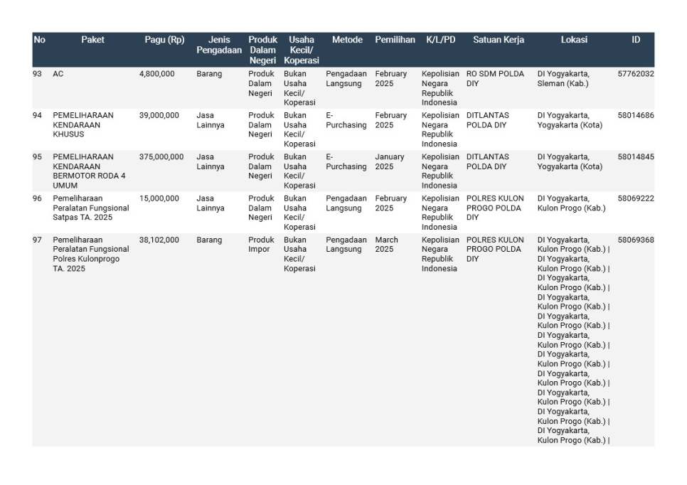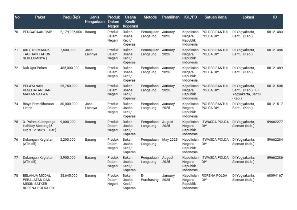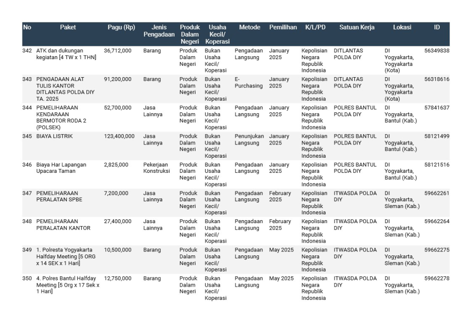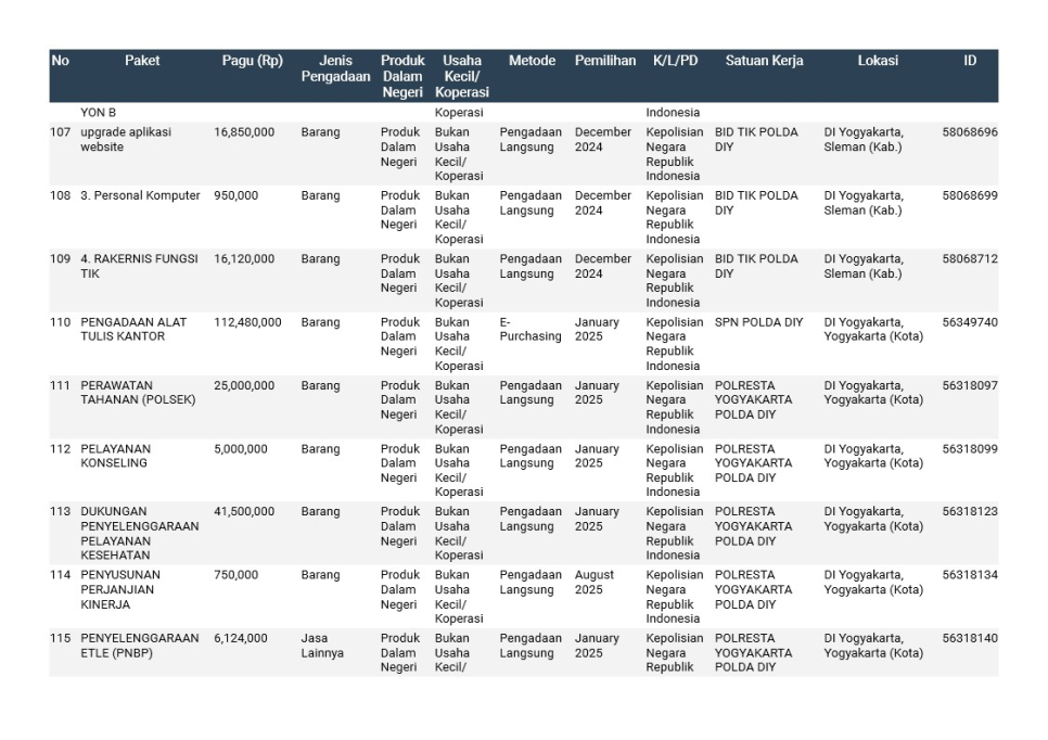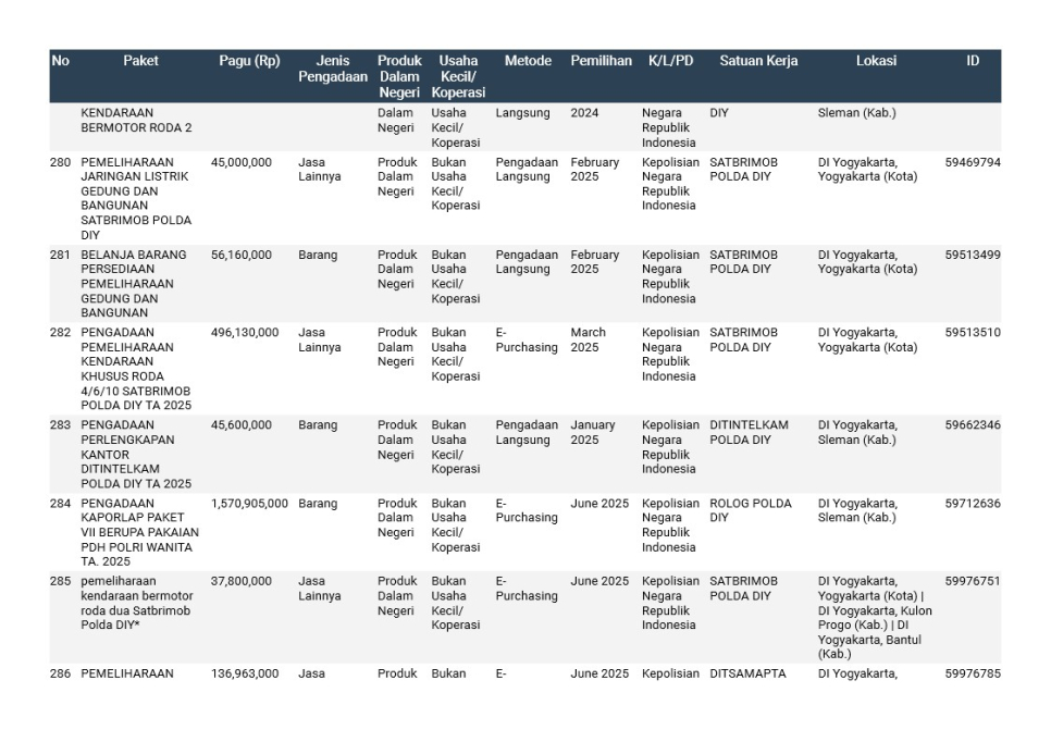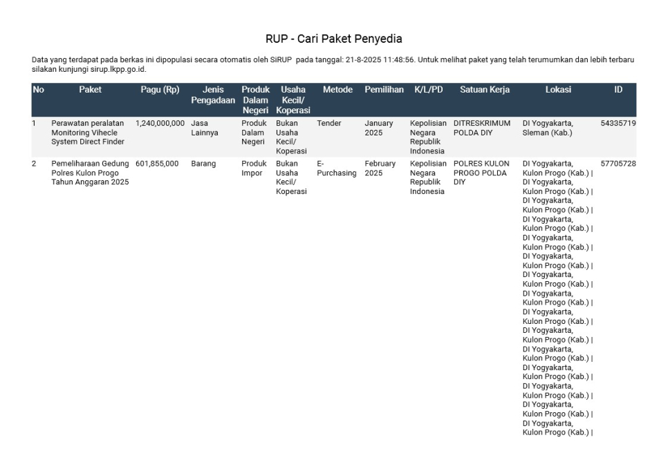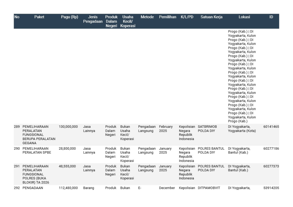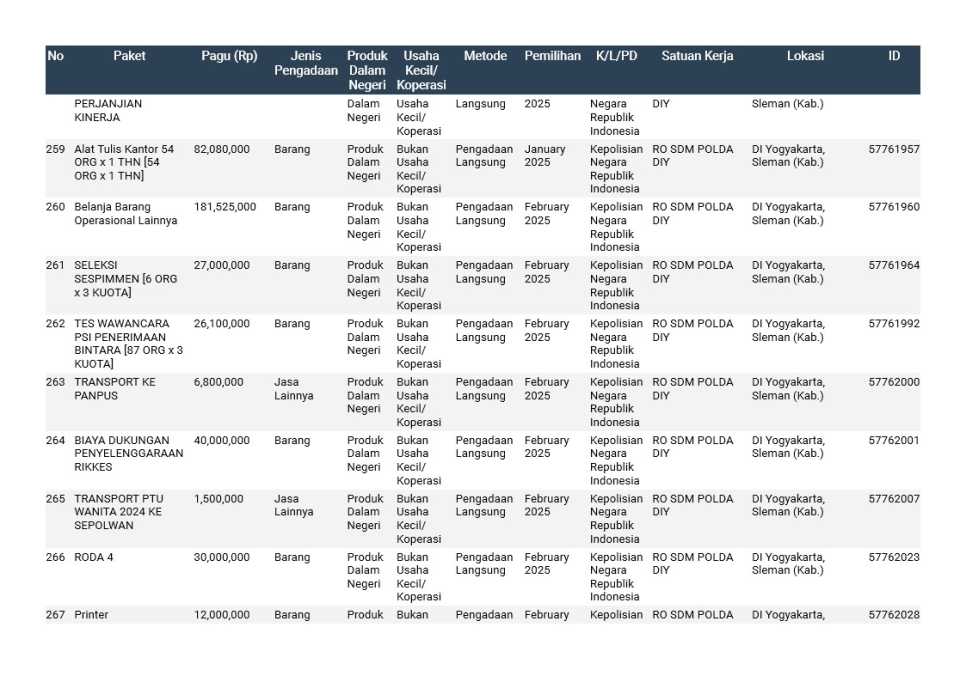 Rencana Umum Pengadaan (RUP) Polda DIY TA. 2025