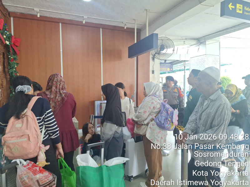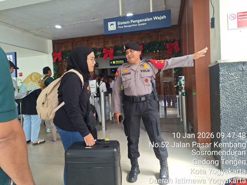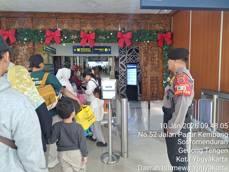 Personel Subditwaster Ditpamobvit Polda DIY melaksanakan bantuan pengamanan di Stasiun Tugu Yogyakarta, Sabtu 10 Januari 2026.