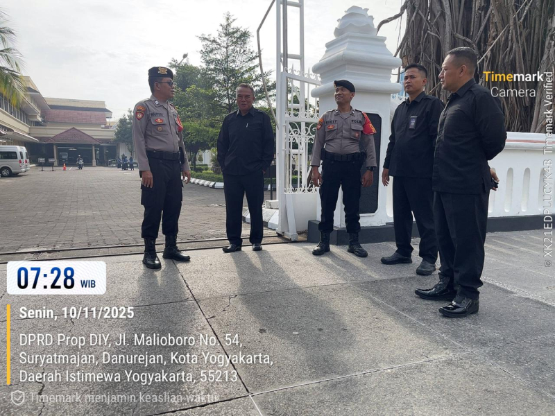 Personel Subdit VIP Ditpamobvit Polda DIY melaksanakan giat bantuan pengamanan di Gedung DPRD Yogyakarta memberikan himbauan kepada Masyarakat/ Wisatawan Nusantara yang berada di depan pintu gerbang DPRD DIY agar selalu menjaga diri, Senin 10 November 2025.