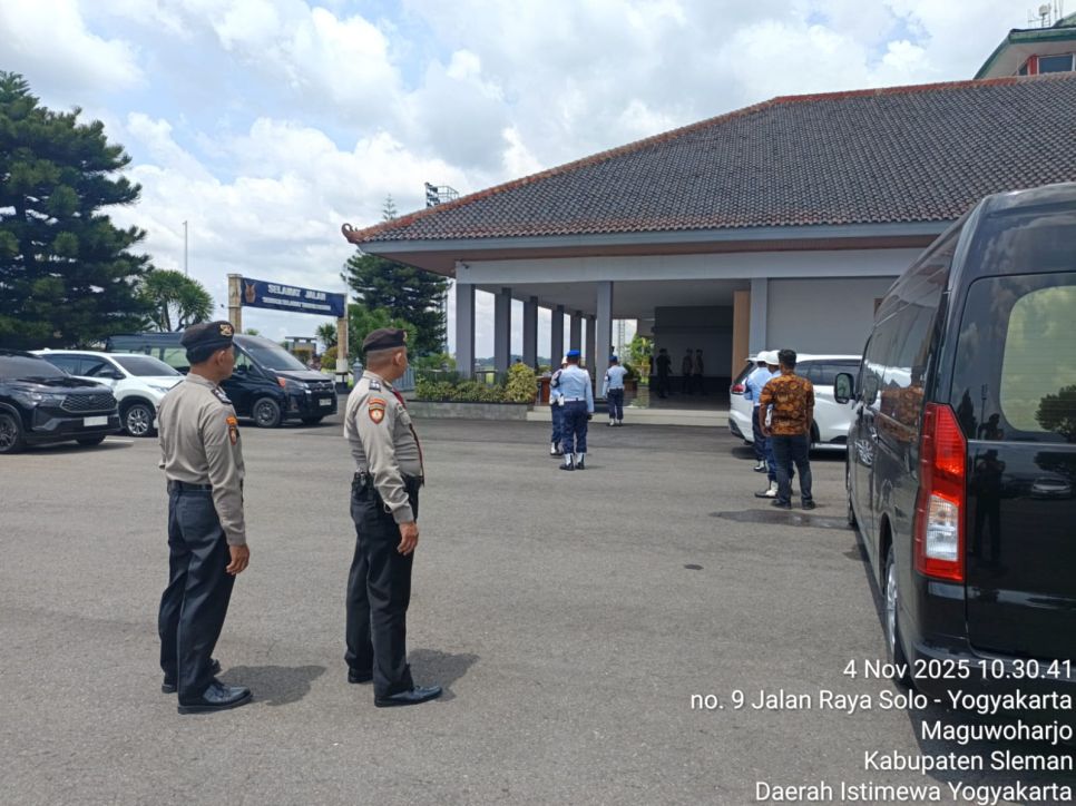 Personel Ditpamobvit Polda DIY melaksanakan kegiatan Pengamanan terbuka kedatangan Kakorpolairud Baharkam Polri di Base Ops Bandara ADS Yogyakarta, Selasa 4 November 2025.