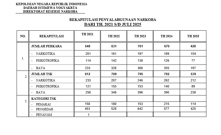REKAPITULASI PENYALAHGUNAAN NARKOBA SEMESTER I 2025