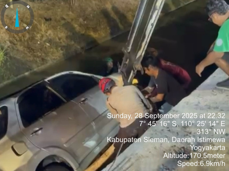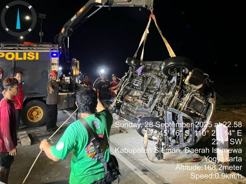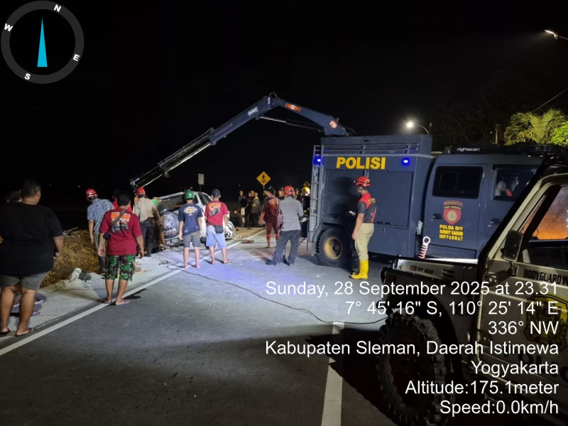 Piket Sie Pammat Regu 2 Ditsamapta Polda DIY yang menerima laporan langsung mendatangi lokasi menggunakan satu unit truk. Sesampainya di lokasi, personel segera melakukan assesment. Proses evakuasi kendaraan dilakukan menggunakan Crane dan berlangsung secara hati-hati agar tidak menimbulkan kerusakan lebih lanjut.