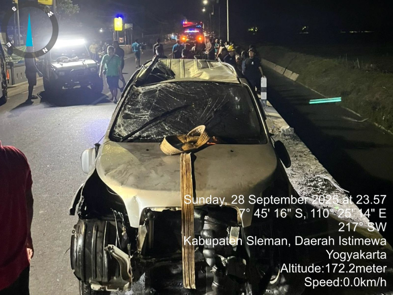 Sebuah mobil jenis Toyota Rush mengalami kecelakaan tunggal di Jalan Gendongan - Klangon Km 01, Dusun Ngentak Ponggok, Kalurahan Sumberagung, Kapanewon Moyudan, Minggu (28/9/2025) malam.