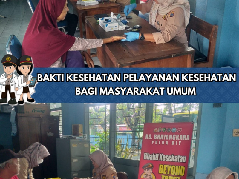 Personel RS Bhayangkara melaksanakan Kegiatan Bakti Kesehatan berupa Pelayanan Kesehatan bagi Masyarakat Umum di Terminal Condong Catur, Depok, Sleman. Pemeriksaan kesehatan meliputi pemeriksaan tekanan darah, gula darah sewaktu, asam urat dan pemberian obat serta vitamin.