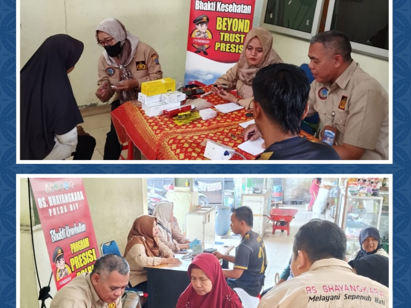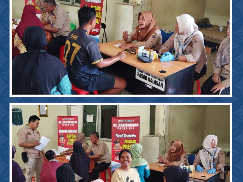 Rabu, 3 September 2025 - Personel RS Bhayangkara melaksanakan Kegiatan Bakti Kesehatan berupa Pelayanan Kesehatan bagi Masyarakat Umum di Pasar Kalasan, Sleman. Pemeriksaan Kesehatan meliputi Pemeriksaan Tekanan Darah, Gula Darah Sewaktu, Asam Urat dan Pemberian Obat serta Vitamin.