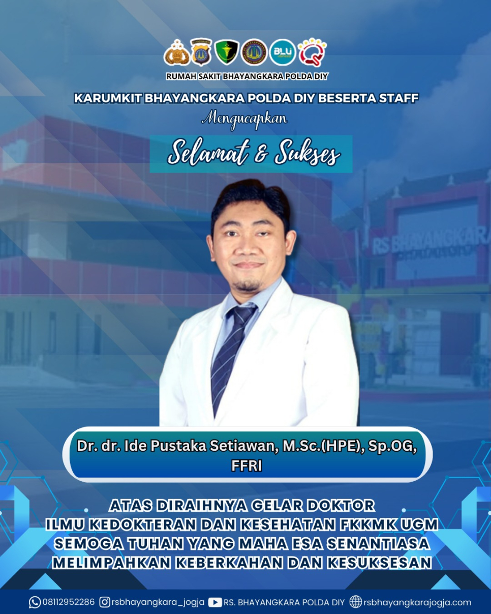 Selamat dan sukses kepada Dr. dr. Ide Pustaka Setiawan, M.Sc., (HPE), Sp.OG., FFRI atas diraihnya gelar Doktor.Prestasi ini menjadi kebanggaan besar bagi Karumkit beserta seluruh staf Rumah Sakit Bhayangkara Polda DIY.