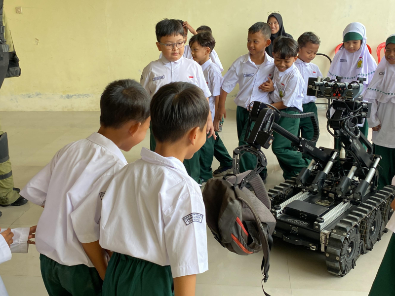 Tak hanya bercerita, kami juga memberikan kesempatan kepada adik-adik untuk melihat langsung berbagai persenjataan, peralatan, dan perlengkapan yang digunakan oleh personel Gegana dalam tugas sehari-hari. Rasa ingin tahu mereka terlihat dari antusiasme saat mencoba mengamati dan bertanya tentang setiap perlengkapan yang kami perlihatkan.