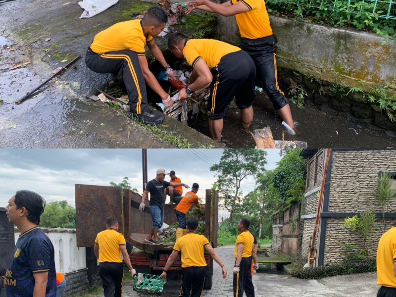 Danyon C Pelopor bersama Personel Batalyon C Pelopor, Dukuh Plumbon Bpk. Halley Mashuri, serta Dinas Lingkungan Hidup Kabupaten Bantul melaksanakan kegiatan kurve pembersihan saluran aliran sungai yang tersumbat sampah di Pedukuhan Plumbon, Kalurahan Banguntapan, Kabupaten Bantul.