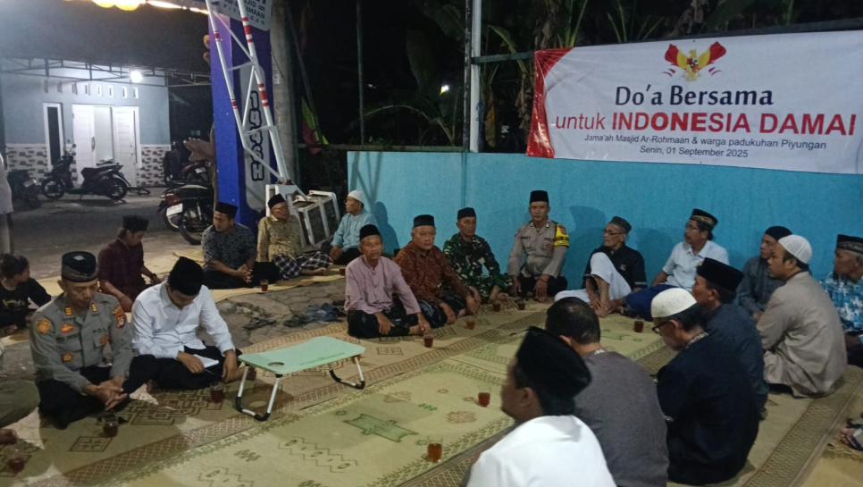 jogja.polri.go.id - Ratusan warga Dusun Piyungan, Srimartani, Piyungan, Bantul, menggelar doa bersama untuk Indonesia damai, Senin malam (1/9/2025). Acara ini dipimpin Ustaz Dr. Imam Mahdi S.IP MA dan dihadiri Kapolsek Piyungan AKP Widho Dwiono SH, perwakilan Danramil, perangkat desa, serta warga setempat.Dukuh Piyungan Toni Subagio menyampaikan apresiasi atas dukungan semua pihak. Ia berharap doa bersama menjadi penguat persatuan demi terwujudnya Indonesia yang aman dan sejahtera.