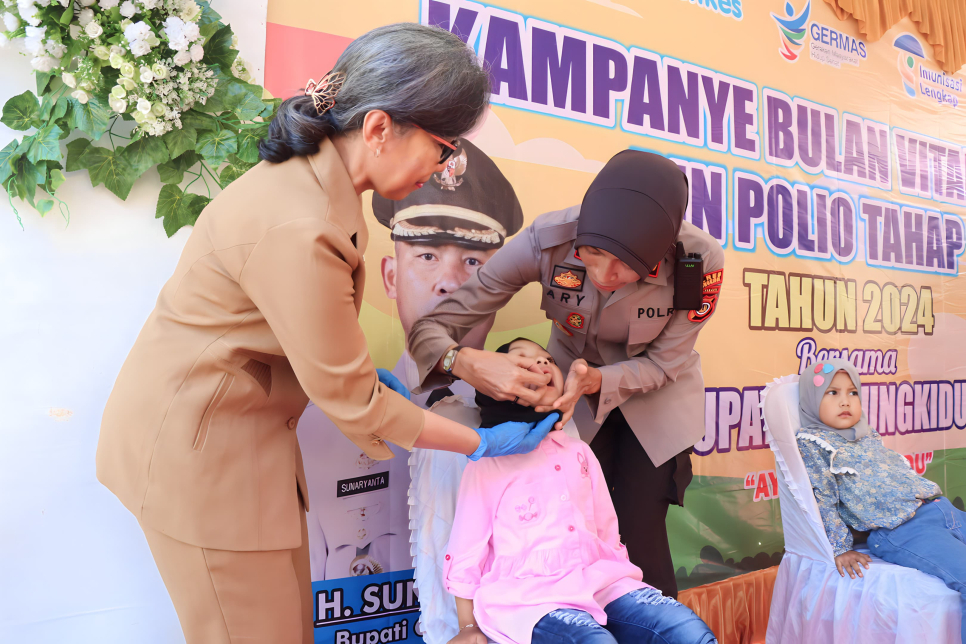jogja.polri.go.id -Humas, Dalam rangka penanggulangan Kejadian Luar Biasa (KLB) Polio, Polres Gunungkidul bersama Pemerintah Kabupaten Gunungkidul menggelar kegiatan imunisasi polio serentak yang bertepatan dengan peringatan Hari Anak Nasional (HAN). Acara ini dihadiri oleh Kapolres Gunungkidul, AKBP Ary Murtini, S.I.K., M.Si., Bupati Gunungkidul, H. Sunaryanta, serta berbagai pejabat dari dinas terkait, 3 Agustus 2024.