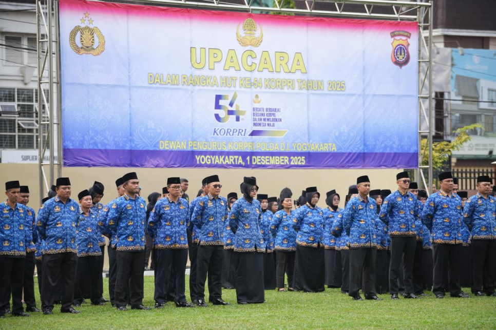 jogja.polri.go.id -Humas, Upacara Peringatan Hari Ulang Tahun Ke-54 Korps Pegawai Republik Indonesia (Korpri) digelar di Halaman Mapolda DIY pada Senin, 1 Desember 2025. Mengusung tema "Bersatu, Berdaulat bersama Korpri dalam Mewujudkan Indonesia Maju", kegiatan ini dipimpin oleh Wakapolda DIY Brigjen Pol Eddy Djunaedi, S.I.K., dan diikuti seluruh PNS Polda DIY serta Polres/ta jajaran. Pelaksanaan upacara berlangsung khidmat sebagai bentuk apresiasi atas pengabdian para ASN dalam menjaga kualitas pelayanan publik dan mendukung tata kelola pemerintahan yang efektif.Dalam kesempatan tersebut, Wakapolda DIY membacakan amanat Ketua Umum Dewan Pengurus Korpri Nasional Prof. Dr. Zudan Arif Fakrulloh, S.H., M.H. yang menekankan pentingnya persatuan, integritas, dan profesionalisme ASN di era digital. Salah satu pesan kuat yang disampaikan adalah bahwa Korpri harus menjadi kekuatan moral sekaligus penggerak birokrasi nasional.