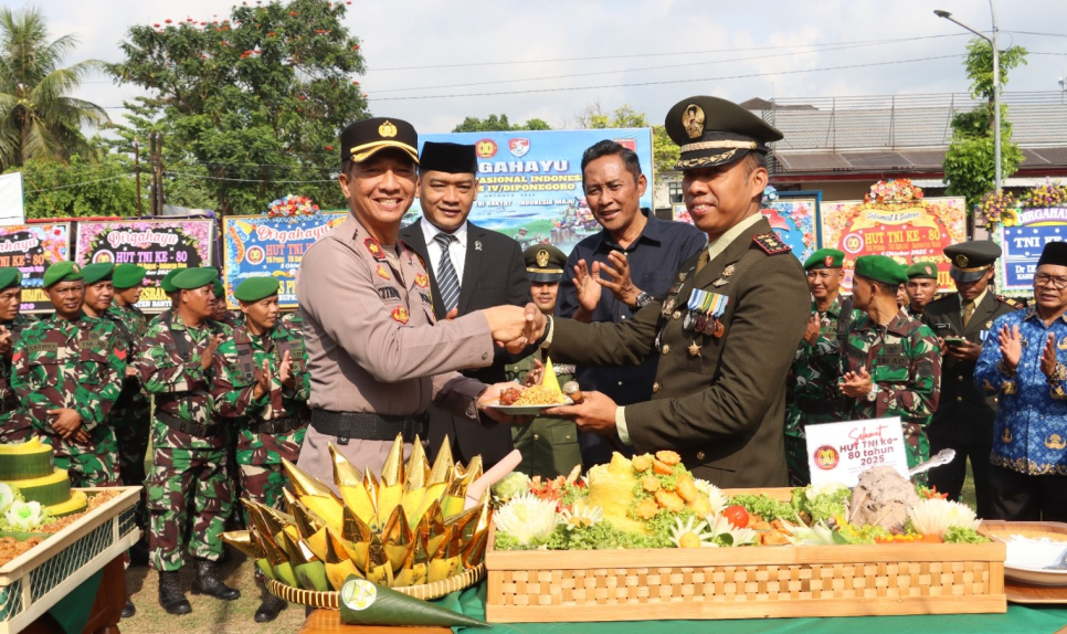 jogja.polri.go.id -Humas, Dalam rangka memperingati Hari Ulang Tahun (HUT) ke-80 Tentara Nasional Indonesia (TNI), Polres Bantul bersama Pemerintah Kabupaten Bantul memberikan kejutan istimewa kepada Kodim 0729/Bantul di Makodim 0729/Bantul, Minggu (5/10/2025) pagi.Rombongan yang dipimpin oleh Wakapolres Bantul Kompol Citra Fatwa R., S.Sos., M.M., M.I.K., tiba di Makodim sambil membawa tumpeng sebagai simbol rasa syukur dan persaudaraan. Kehadiran mereka disambut hangat oleh Komandan Kodim 0729/Bantul Letkol Kav Fikri Nurheldi, S.E., M.Han., bersama jajaran perwira dan anggota Kodim.