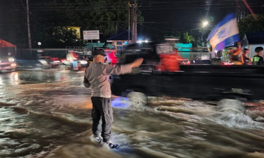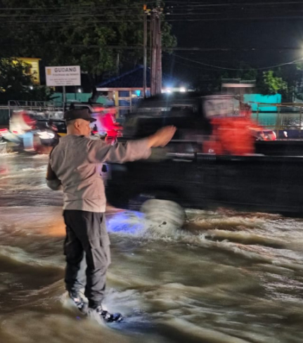 Personel Polsek Sedayu turun ke lokasi banjir di jalan raya Jogja-Wates tepatnya di depan PLN ...