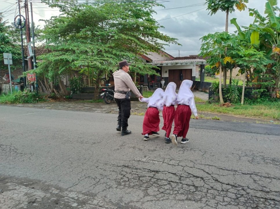 Anggota Polresta Sleman Laksanakan Pengaturan Lalu Lintas Pagi Hari, Bantu Penyeberangan Siswa