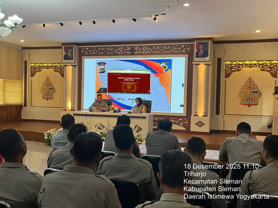Sleman - Kasi Pengawasan (Kasiwas) Polresta Sleman, AKP Ombang Siswoyo, S.H., melaksanakan sosialisasi Whistle Blowing System (WBS) Polri kepada seluruh personel Polresta Sleman. Kegiatan tersebut berlangsung di Aula Hoengeng Polresta Sleman, pada Kamis (18/12/2025).Sosialisasi WBS ini bertujuan untuk meningkatkan kesadaran dan partisipasi aktif personel dalam upaya pencegahan serta pemberantasan tindak pidana korupsi di lingkungan Polri, khususnya di Polresta Sleman.