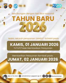 Sleman - Sehubungan dengan Hari Libur Nasional dalam rangka Tahun Baru 2026, dengan ini kami informasikan kepada seluruh masyarakat terkait operasional pelayanan SAMSAT Sleman, sebagai berikut:Kamis, 01 Januari 2026