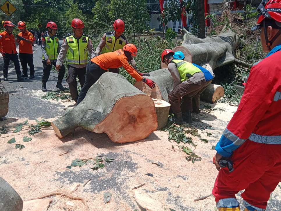 Proses evakuasi pohon tumbang beserta korban dilakukan oleh petugas gabungan yang melibatkan unsur Polri, Basarnas Sleman, Damkar UGM, dan masyarakat setempat. Seluruh rangkaian kegiatan evakuasi berjalan dengan aman dan lancar.