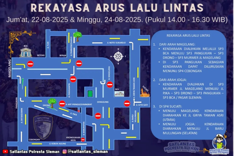 Sleman - Dalam rangka mendukung kelancaran dan keamanan kegiatan Independence Day Military Expo 2025, Satlantas Polresta Sleman bersama Dinas Terkait menerapkan Manajemen Rekayasa Lalu Lintas (MRLL) pada tanggal 21-24 Agustus 2025 di sekitar area Lapangan Denggung Sleman.Kasat Lantas Polresta Sleman AKP Mulyanto, S.E., S.H., M.M. menyampaikan bahwa rekayasa lalu lintas ini diberlakukan untuk mengantisipasi potensi kepadatan kendaraan dan memastikan arus lalu lintas tetap tertib.