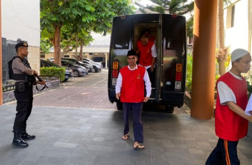 Para tahanan diangkut menggunakan mobil tahanan khusus dan dikawal oleh petugas bersenjata lengkap.