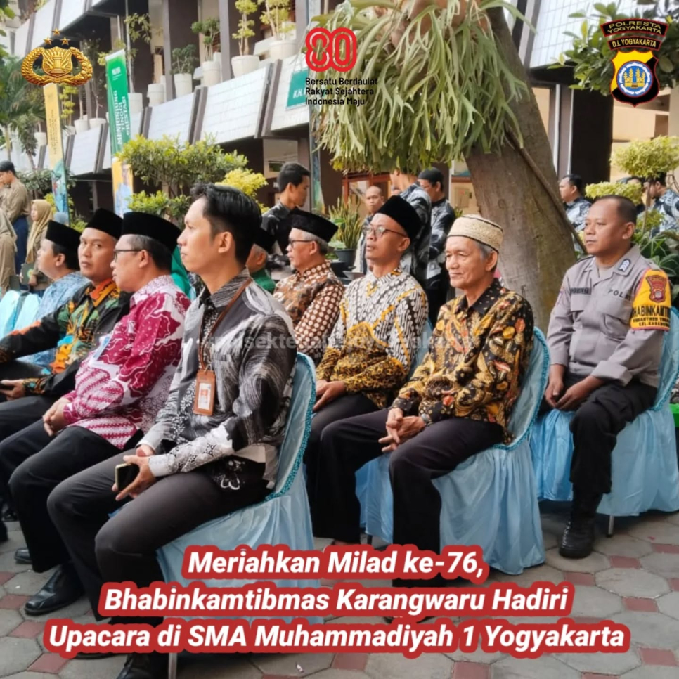Bhabinkamtibmas Kelurahan Karangwaru Bripka Sugeng Haryanto, mewakili Kapolsek Tegalrejo menghadiri upacara bendera dalam rangka Milad ke-76 SMA Muhammadiyah 1 (Muhi) Yogyakarta pada Jumat pagi (5/9/2025). Upacara yang berlangsung khidmat di lapangan sekolah ini mengangkat tema "Pendidikan Cerdas Berbasis AI: Inovasi untuk Masa Depan, Berakar pada Nilai-Nilai Luhur."Bertindak sebagai inspektur upacara adalah Ketua Pimpinan Wilayah Muhammadiyah (PWM) DIY, Dr. Muhammad Ikhwan Ahada, S.Ag., M.A. Dalam sambutannya, ia menegaskan bahwa milad bukan sekadar perayaan ulang tahun, tetapi juga momentum untuk muhasabah, mensyukuri nikmat, serta memperkuat tekad hidup sesuai ajaran agama. Ia turut mengapresiasi 736 prestasi gemilang yang diraih siswa SMA Muhi sepanjang tahun terakhir, baik di tingkat daerah, nasional, maupun internasional. Mengutip Imam Syafi'i, ia mengingatkan pentingnya iman, akhlak, dan ilmu sebagai bekal utama bagi siswa SMA Muhi agar menjadi kader Muhammadiyah sekaligus generasi unggul bangsa.