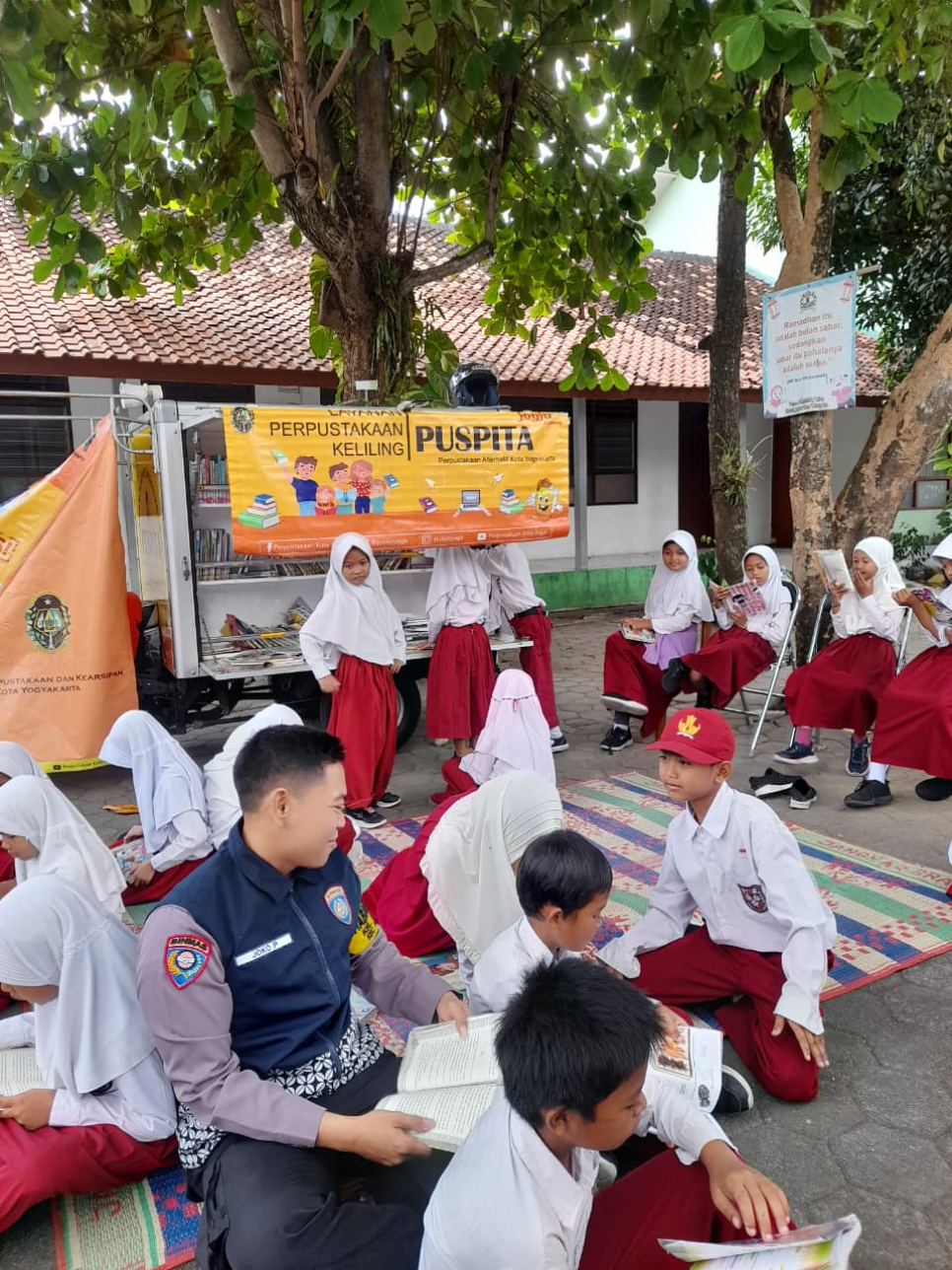 Suasana ceria tampak di halaman SD Negeri Tegalmulyo, Pakuncen, Wirobrajan, saat anak-anak berkumpul menikmati kegiatan membaca buku yang difasilitasi PUSPITA (Layanan Perpustakaan Keliling) Perpustakaan Alternatif Kota Yogyakarta pada Senin pagi (29/9/2025). Tidak hanya disuguhi bacaan menarik, para siswa juga mendapat motivasi langsung dari Bhabinkamtibmas Kelurahan Pakuncen, Bripka Joko Purnomo, S.H.Kehadiran Bhabinkamtibmas dalam kegiatan literasi ini menjadi wujud nyata kepedulian Polri terhadap dunia pendidikan. Dengan penuh kehangatan, Bripka Joko mengajak anak-anak untuk rajin membaca, giat belajar, serta menjauhi perbuatan negatif seperti bullying. Ia juga menanamkan nilai kedisiplinan, kejujuran, dan saling menghargai dengan bahasa sederhana agar mudah dipahami oleh para siswa.