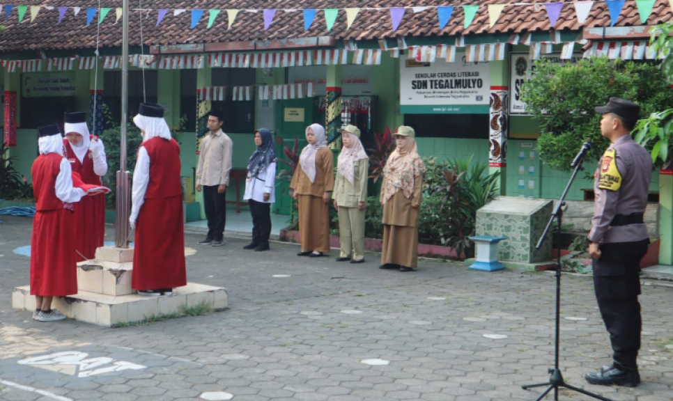 Dalam rangka meningkatkan sinergi Polri dengan dunia pendidikan, Bhabinkamtibmas Kelurahan Pakuncen Polsek Wirobrajan, Bripka Joko Purnomo, S.H., bertindak sebagai pembina upacara bendera di SD Negeri Tegalmulyo, Pakuncen, Wirobrajan, Senin (29/9/2025). Upacara yang dimulai pukul 07.00 WIB ini diikuti 157 siswa dari kelas 1 hingga kelas 6, serta dihadiri Kepala Sekolah, guru, dan karyawan sekolah.Dalam amanatnya, Bripka Joko menekankan perlunya menanamkan nilai-nilai nasionalisme, meningkatkan kedisiplinan dan tanggung jawab, menjauhi kenakalan remaja, tidak melakukan bullying, menjaga sopan santun, rajin belajar, serta berbakti kepada orang tua dan guru. Ia menegaskan bahwa Polri hadir sebagai sahabat anak sekaligus mitra pendidikan dalam menciptakan lingkungan belajar yang aman, nyaman, dan kondusif.