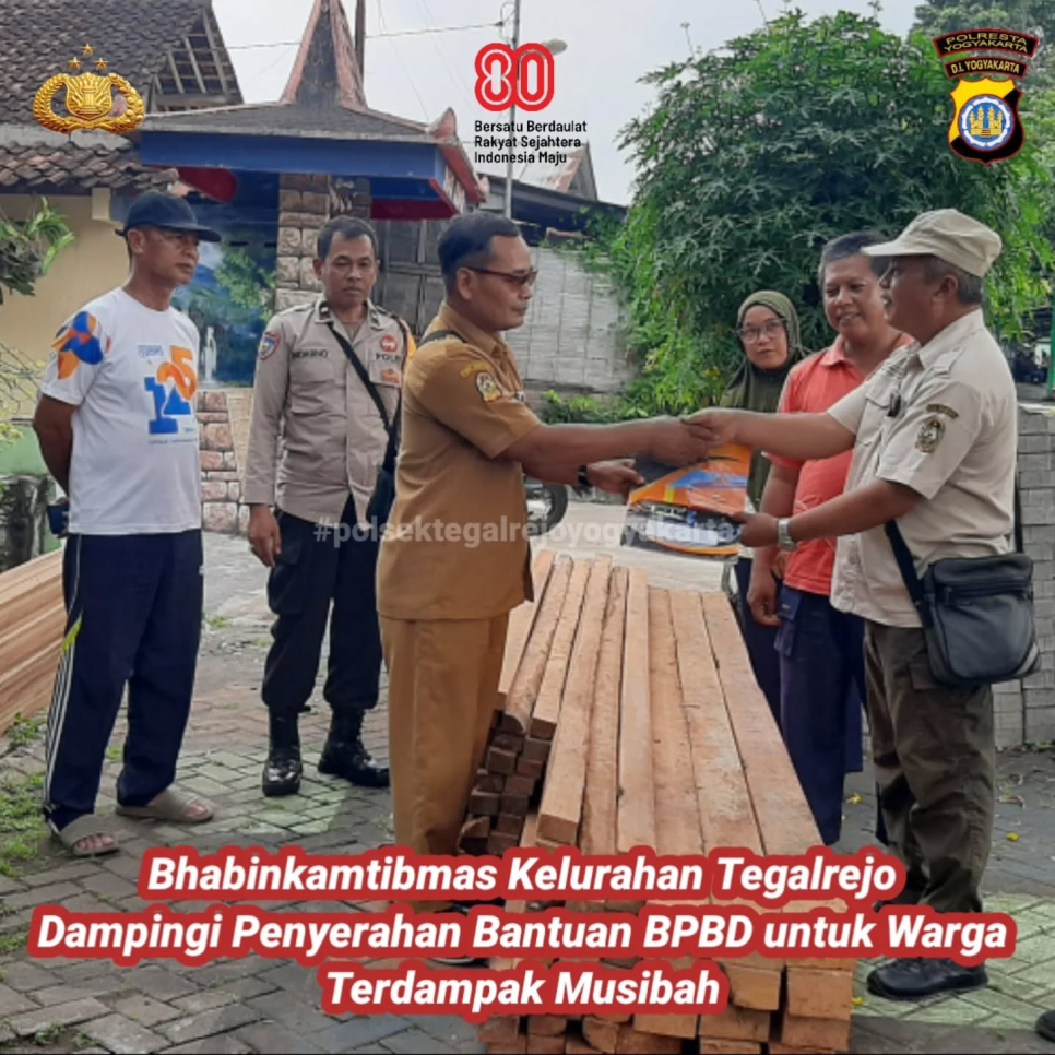 Bhabinkamtibmas Kelurahan Tegalrejo, Aipda Indarno, S.H., melaksanakan monitoring kegiatan penyerahan bantuan dari BPBD Kota Yogyakarta kepada salah satu warga RT 17 RW 05 Kelurahan Tegalrejo, Tegalrejo, Kota Yogyakarta, Senin (20/10/2025) pagi.Bantuan yang diberikan berupa material bangunan, di antaranya kayu blandar sebanyak 12 batang, usuk 25 batang, serta reng ukuran 200 cm sebanyak 200 batang. Penyerahan dilakukan di rumah warga penerima bantuan yang sebelumnya mengalami kerusakan pada bagian atap akibat musibah alam.