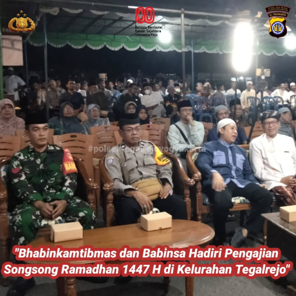 Bhabinkamtibmas Kelurahan Tegalrejo Polsek Tegalrejo, Aipda Indarno, S.H., bersama Babinsa Kelurahan Tegalrejo menghadiri sekaligus mengamankan kegiatan Pengajian Songsong Ramadhan 1447 Hijriah yang diselenggarakan di Masjid Pangeran Diponegoro, Kelurahan Tegalrejo, pada Sabtu (31/1/2026) malam.Pengajian tersebut menghadirkan penceramah Ustadz Wuntat Wawan Sembodo, S.Ag., dengan mengangkat tema "Hakekat Ramadhan bagi Umat Muslim". Dalam ceramahnya, Ustadz Wuntat Wawan Sembodo menyampaikan bahwa bulan Ramadhan merupakan momentum untuk meningkatkan keimanan dan ketakwaan, memperbaiki akhlak, serta memperkuat kepedulian sosial antar sesama.