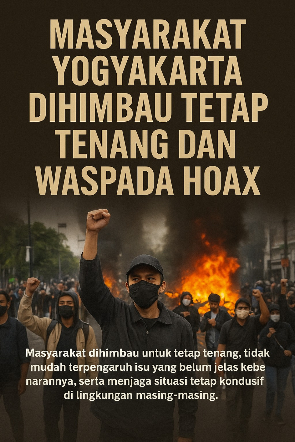 Di tengah maraknya aksi demonstrasi yang berlangsung di sejumlah titik wilayah Yogyakarta dalam beberapa waktu terakhir, pemerintah bersama aparat keamanan mengajak masyarakat untuk lebih waspada terhadap penyebaran berita bohong (hoaks) maupun ajakan provokatif di media sosial. Setiap informasi yang diterima hendaknya selalu diverifikasi terlebih dahulu sebelum dibagikan. Dengan menerapkan prinsip saring sebelum sharing, warga dapat berperan aktif dalam mencegah keresahan dan perpecahan di tengah lingkungan.Masyarakat juga diingatkan agar dalam menyampaikan pendapat tetap menjunjung etika dan menghindari tindakan anarkis maupun perusakan fasilitas umum. Tindakan tersebut tidak hanya merugikan pelaku sendiri, tetapi juga mengganggu kepentingan banyak pihak. Kerusakan pada fasilitas umum akan menghambat kenyamanan bersama serta menimbulkan beban perbaikan yang besar bagi masyarakat dan pemerintah.
