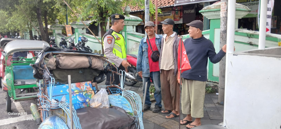 Unit Patroli Polsek Kraton yang dipimpin oleh Kanit Samapta Iptu Suryadi melaksanakan kegiatan sambang dan patroli dialogis bersama para pengemudi becak di kawasan Pasar Ngasem, Selasa pagi (20/1/2026). Kegiatan ini bertujuan untuk menjaga stabilitas keamanan dan ketertiban masyarakat sekaligus memastikan kelancaran arus lalu lintas di kawasan pusat aktivitas ekonomi dan wisata tersebut.Mengingat kondisi ruas jalan di sekitar Pasar Ngasem yang relatif sempit dan memiliki tingkat kepadatan kendaraan yang tinggi, petugas memberikan perhatian khusus terhadap penataan parkir becak. Para pengemudi becak diimbau agar memarkirkan kendaraannya dengan rapi serta tidak menggunakan bahu jalan, guna mencegah terjadinya kemacetan dan menjaga kelancaran mobilitas kendaraan lainnya.