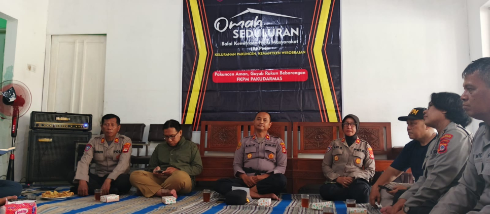 Forum Kemitraan Polisi dan Masyarakat (FKPM) Pakudarmas Kelurahan Pakuncen, Kemantren Wirobrajan, menggelar rapat koordinasi dan pembinaan bersama jajaran Polresta Yogyakarta dan Polsek Wirobrajan. Kegiatan ini mengambil tema "Pakuncen Aman, Guyub, Rukun, Berbarengan" dan berlangsung di Omah Seduluran Balai Kemitraan Polisi Masyarakat (BKPM) Kelurahan Pakuncen, Minggu (2/11/25).Rapat strategis ini dihadiri oleh Kasat Binmas Polresta Yogyakarta Kompol Ani Sulistyarini, S.Kom., M.H.Li., Kapolsek Wirobrajan Kompol Arif, serta seluruh anggota FKPM Pakudarmas.