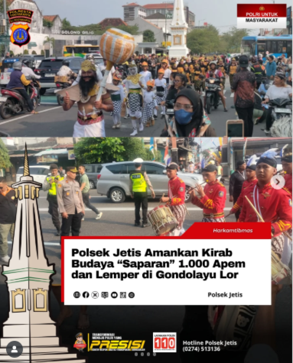 Polsek Jetis mengamankan upacara adat Kirab Budaya "Saparan" 1.000 Apem dan Lemper di Kampung Gondolayu Lor, Kelurahan Cokrodiningratan, Minggu sore (24/8/2025). Pengamanan yang dipimpin langsung oleh Kapolsek Jetis, Kompol Sumalugi, S.H., M.H., ini memastikan jalannya acara berlangsung aman, tertib, dan lancar.Kirab budaya ini diikuti oleh beragam elemen masyarakat dengan mengenakan pakaian adat dan membawa gunungan apem, lemper, serta sayuran. Iring-iringan melintasi Jalan Jenderal Sudirman dan Tugu Pal Putih, ikon Kota Yogyakarta, sebelum berakhir di Kampung Gondolayu Lor.