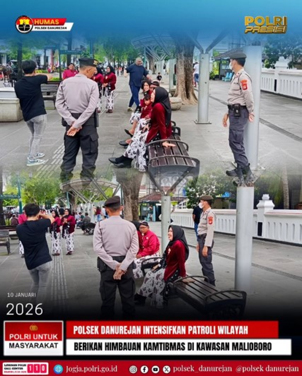 Dalam rangka mengantisipasi potensi gangguan keamanan dan ketertiban masyarakat, Polsek Danurejan Polresta Yogyakarta meningkatkan kegiatan patroli wilayah, khususnya di kawasan wisata. Kegiatan tersebut dilaksanakan pada Sabtu sore (10/01/2026).Patroli dipimpin oleh Panit Samapta Polsek Danurejan Aiptu Arseno Pierera, melibatkan personel piket siaga, dengan sasaran utama kawasan pedestrian Malioboro Yogyakarta.