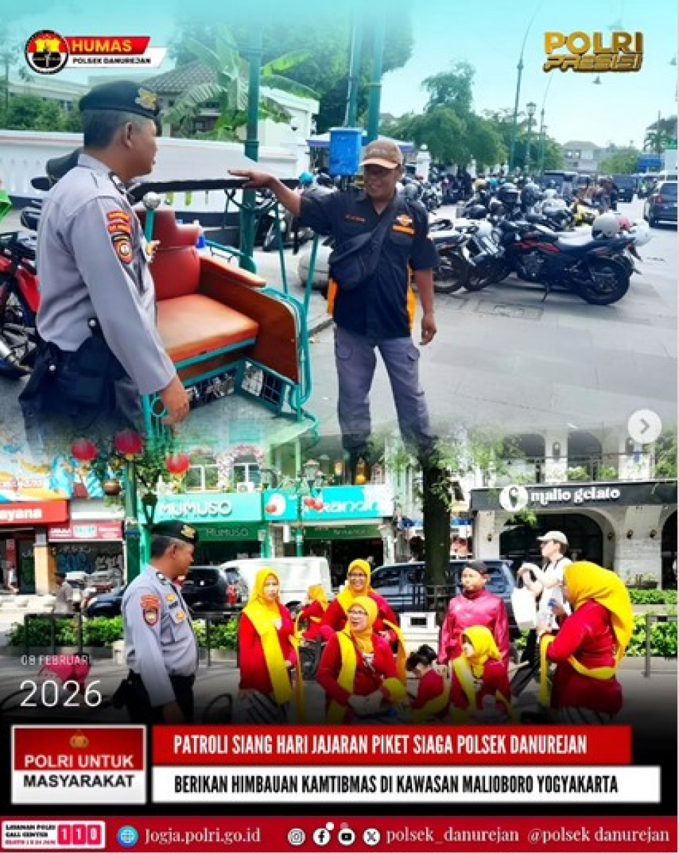 Personel Unit Samapta Polsek Danurejan Polresta Yogyakarta melaksanakan patroli siang hari di kawasan Malioboro, Minggu (8/2/2026). Patroli ini dilakukan mengingat Malioboro merupakan pusat aktivitas masyarakat dan wisatawan yang membutuhkan pengawasan ekstra, khususnya pada akhir pekan.Kegiatan patroli dipimpin oleh Aiptu Andriyadi bersama jajaran anggota Unit Samapta. Petugas menyisir area pedestrian hingga titik-titik keramaian untuk memastikan situasi di wilayah hukum Polsek Danurejan tetap aman dan terkendali.