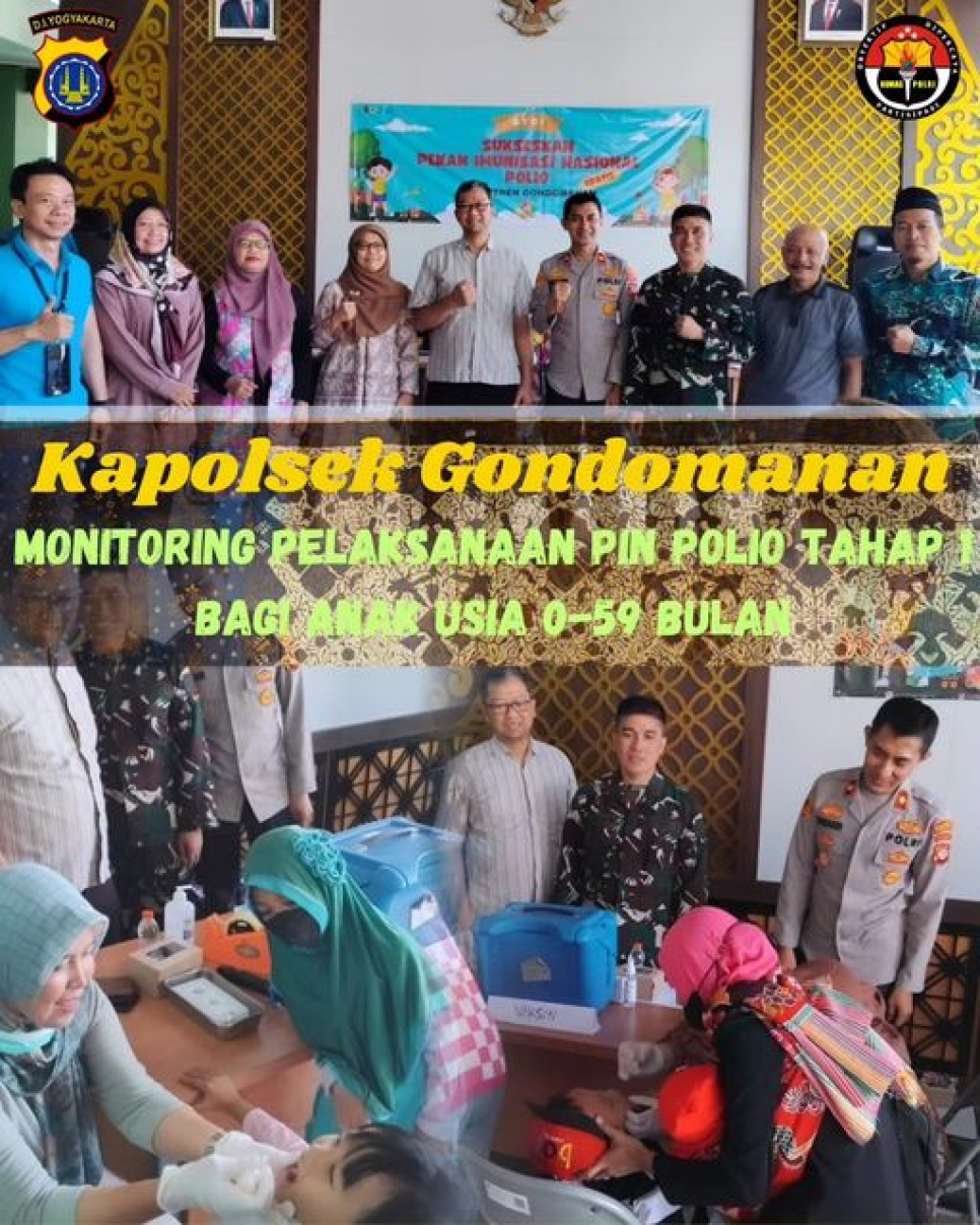 Kapolsek Gondomanan, Kompol Suwardi S.Pd.,S.H., bersama Forkopimcam Gondomanan melakukan pemantauan langsung terhadap pelaksanaan Pekan Imunisasi Nasional (PIN) Polio Tahap 1 di wilayah Kemantren Gondomanan pada Sabtu (27/07/24). Kegiatan ini bertujuan untuk memastikan program imunisasi nasional berjalan sesuai rencana dan semua anak mendapatkan perlindungan yang optimal dari penyakit polio.Dalam kunjungannya, Kapolsek Gondomanan meninjau langsung pelaksanaan imunisasi di sejumlah titik. Beliau berinteraksi dengan petugas kesehatan, orang tua, dan anak-anak yang sedang mengikuti imunisasi. "Kami ingin memastikan bahwa program imunisasi ini berjalan dengan lancar dan semua anak mendapatkan haknya untuk hidup sehat," ujar Kapolsek Suwardi.