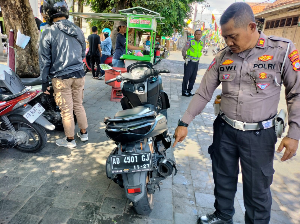 Polsek Kotagede Polresta Yogyakarta melakukan razia kendaraan bermotor knalpot brong di depan pasar Kotagede, Kamis (14/12/23) pagi. Kegiatan ini dipimpin oleh Kanit Lalulintas Polsek Kotagede, Iptu Dwi Antono, beserta anggotanya.Dalam razia tersebut, petugas berhasil mengamankan dan menilang satu unit sepeda motor knalpot brong dari seorang pengendara.