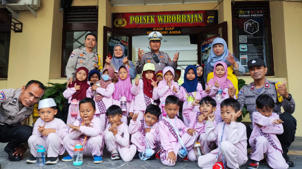 Polsek Wirobrajan Polres Yogyakarta menerima kunjungan dari puluhan murid TK ABA Ketanggungan Wirobrajan, Jumat (20/10/2023). Kegiatan ini bertujuan untuk mengenalkan tugas dan fungsi polisi kepada anak-anak sejak usia dini, sehingga kehadiran polisi tidak lagi menjadi sosok yang menakutkan, melainkan sosok yang ramah dan dicintai oleh masyarakat.Dalam kegiatan tersebut, anak - anak disambut Kanit Lantas Polsek Wirobrajan Iptu Ngadiyono dan langsung diajak untuk berkeliling kantor polisi dan melihat-lihat berbagai fasilitas yang ada. Mereka juga diajarkan tentang rambu-rambu lalu lintas dan tata cara berlalu lintas yang aman.