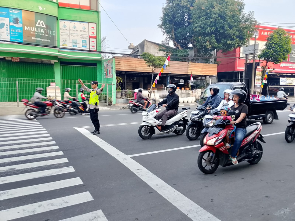 Dalam kegiatan ini, petugas melakukan pengaturan lalu lintas, membantu para pejalan kaki menyeberang jalan, dan memberikan imbauan tertib lalu lintas kepada pengendara.