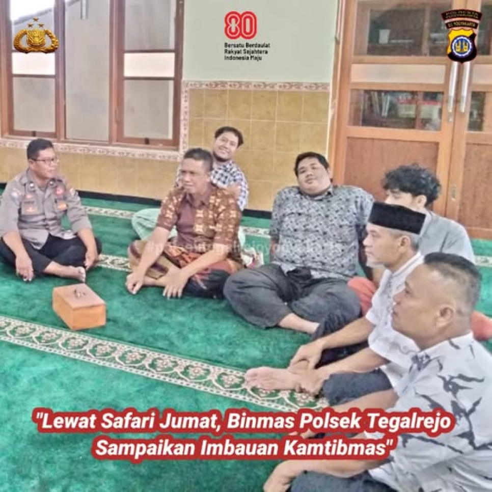 Panit 2 Binmas Polsek Tegalrejo, Aiptu Hari Bangun Purnomo, melaksanakan kegiatan sambang dan Safari Jumat di Masjid Nurotain RW 09, pada Jumat siang (2/1/2026).Kegiatan tersebut dimanfaatkan sebagai sarana silaturahmi sekaligus menyampaikan imbauan kamtibmas kepada tokoh masyarakat, tokoh agama, serta para pemuda agar turut berperan aktif dalam menjaga keamanan dan ketertiban lingkungan.