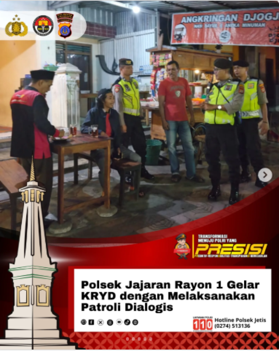 Jajaran Polsek Rayon 1 Polresta Yogyakarta yang mencakup Polsek Jetis, Tegalrejo, Gedongtengen, dan Ngampilan, menggelar Kegiatan Rutin Yang Ditingkatkan (KRYD) dengan melaksanakan patroli dialogis secara serentak pada Kamis dini hari (23/10/2025).Patroli gabungan ini bertujuan menciptakan suasana aman dan nyaman di tengah masyarakat pada jam-jam rawan, sekaligus memperkuat sinergi antarpolsek di Rayon 1 dalam menjaga kondusivitas wilayah.