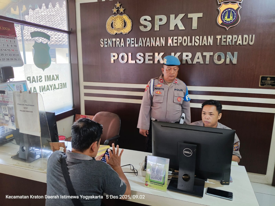 Pelayanan publik di Sentra Pelayanan Kepolisian Terpadu (SPKT) Polsek Kraton mendapatkan pengawasan langsung pada Jumat pagi (5/12/25). Aiptu Prasetyo, Kepala Seksi Profesi dan Pengamanan (Kasi Propam) Polsek Kraton, mendampingi Ka SPKT, Aiptu Adi, saat menangani proses pembuatan Surat Kehilangan di ruang SPKT.Pendampingan ini bertujuan untuk memastikan seluruh prosedur pelayanan berjalan lancar dan sesuai aturan. Hal ini dilakukan demi menjaga kepercayaan warga terhadap institusi Polri.